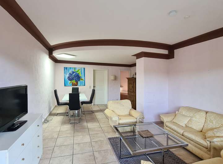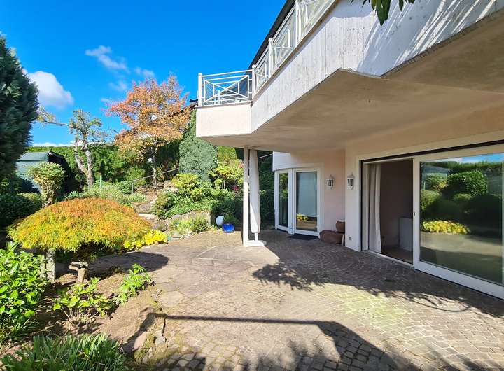 Die Einliegerwohnung verfügt über ein Wohnzimmer, zwei Schlafzimmer, ein separaten Bereich für die Küche sowie über ein Tageslichtbad. Darüber hinaus besteht ein Zugang auf eine weitere Terrasse und in den Garten.