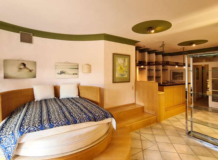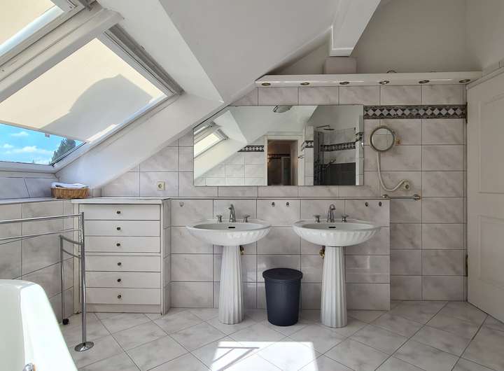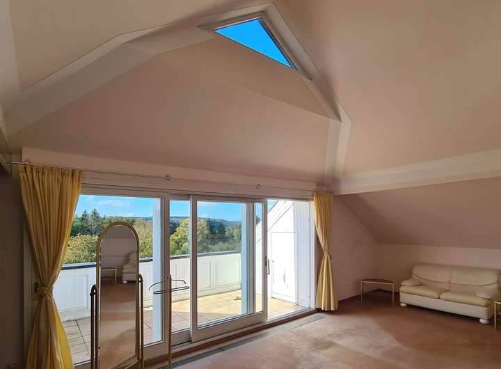 Das Obergeschoss umfasst ein komfortables Schlafzimmer mit angrenzendem Ankleidebereich. Auch hier sorgen große Fensterfronten und der Zugang zur charmanten Loggia für einen schönen Ausblick. Die Galerie ist geschickt geschnitten, so dass sich dort ein Arbeitsbereich einrichten lässt. Außerdem ist ein weiterer Raum vorhanden, der zusätzliche Fläche bietet. Ein großes Tageslichtbad mit Eckbadewanne, Dusche und separatem WC bietet Raum für Entspannung.