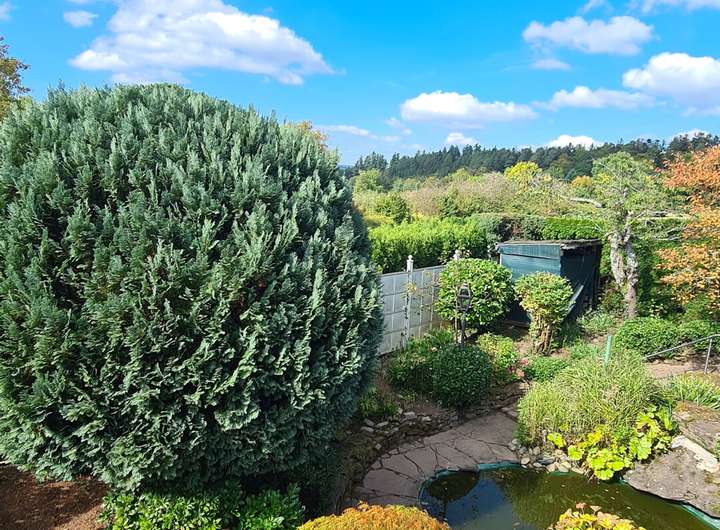 Auf dem ca. 703 m² großen, liebevoll angelegten Grundstück mit Teichanlage und gepflegtem Gartenbereich genießen Sie Ruhe und Privatsphäre.