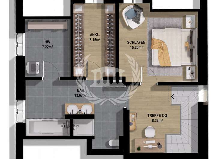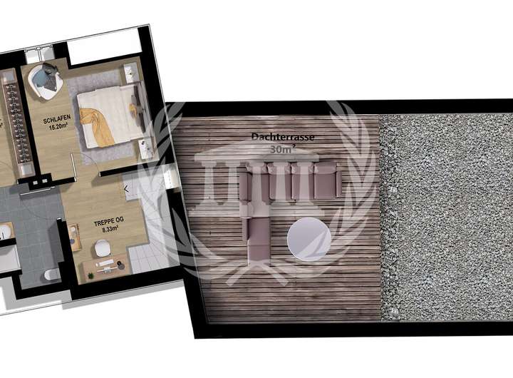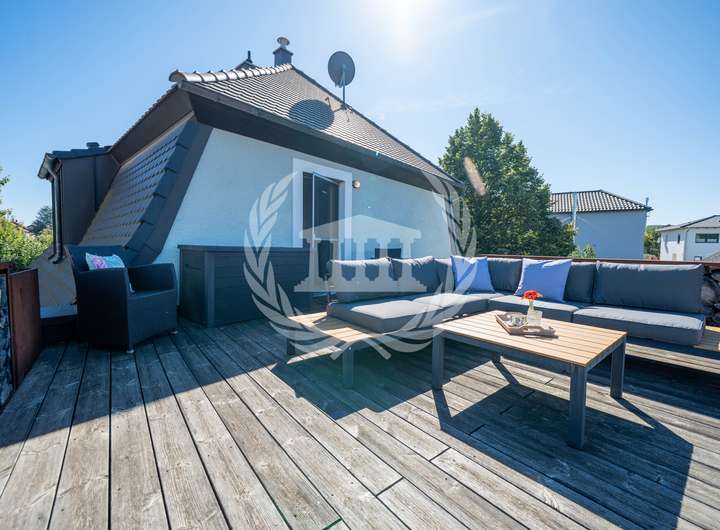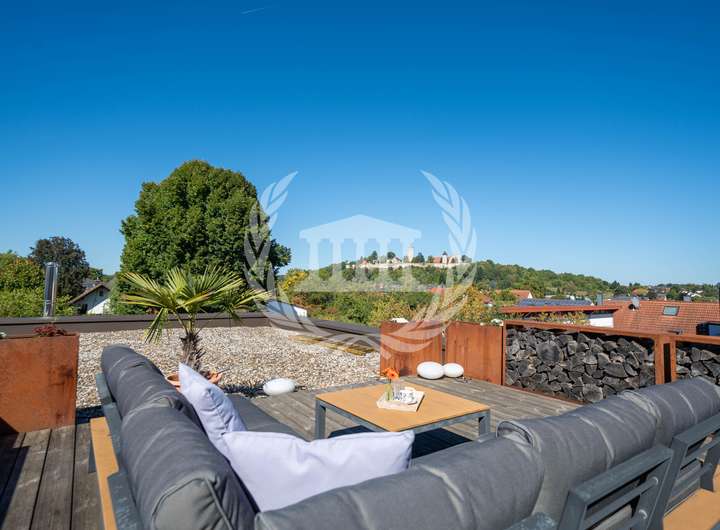 Das Obergeschoss überzeugt mit einem weiteren Schlafzimmer, einem großzügigen Badezimmer sowie einer angrenzenden Ankleide und einem Hauswirtschaftsraum. Von hier aus führt der Weg auf die rund 30 m² große Dachterrasse, die mit einem atemberaubenden Blick auf die Burg zum Verweilen einlädt.