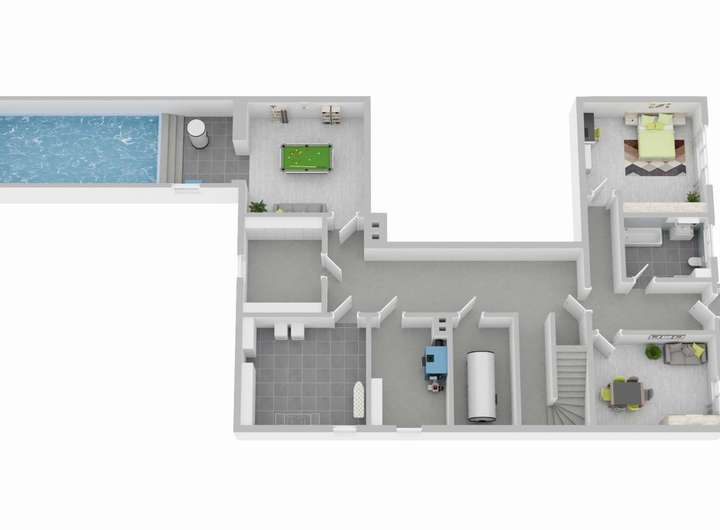 Das aktuell stillgelegte Schwimmbad im Untergeschoss eröffnet die Möglichkeit, einen hochwertigen Wellness- oder Spa-Bereich zu realisieren.