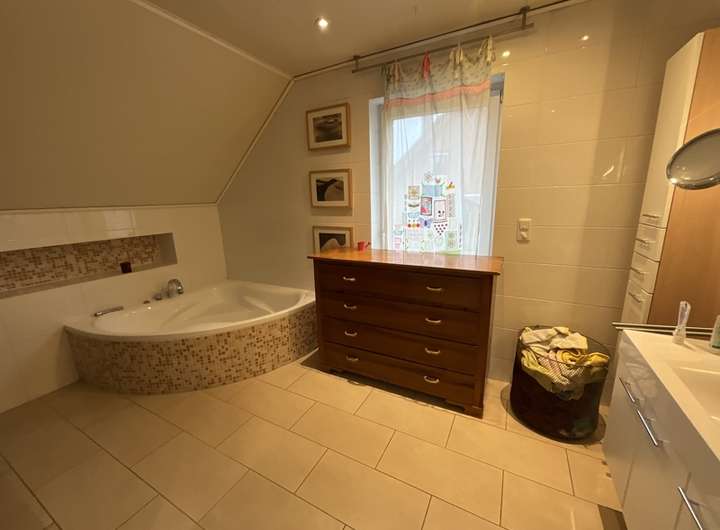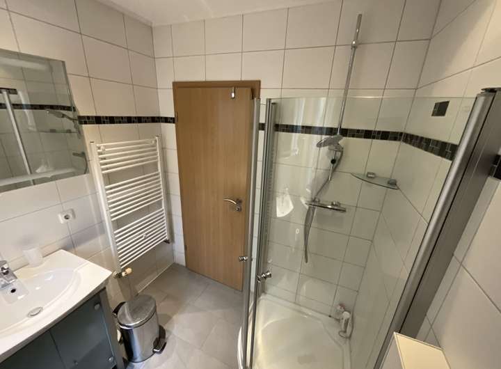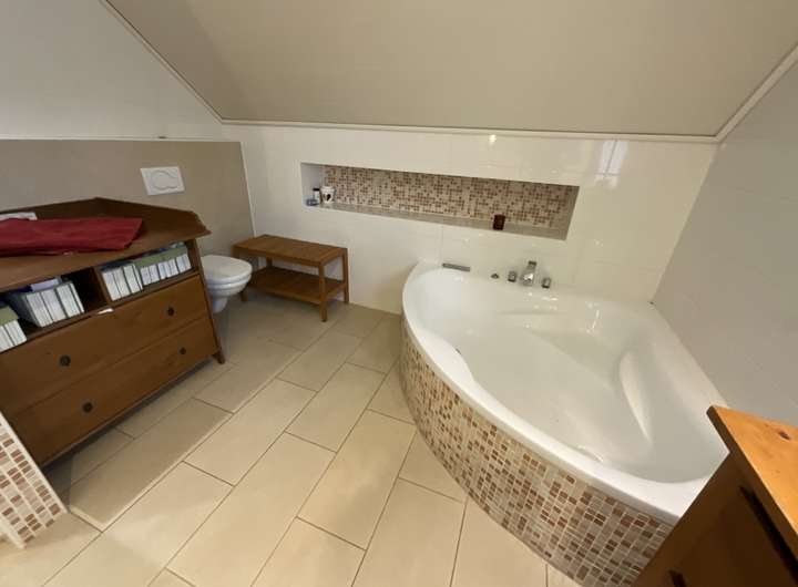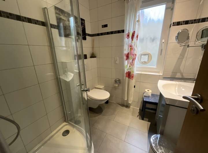 Das moderne Tageslichtbad verfügt über eine Eckbadewanne, Dusche, und einen Waschtisch. Ein Abstellraum, der sich direkt neben einem der Schlafzimmer befindet, bietet Platz für diverse Gegenstände oder könnte als Ankleideraum genutzt werden.