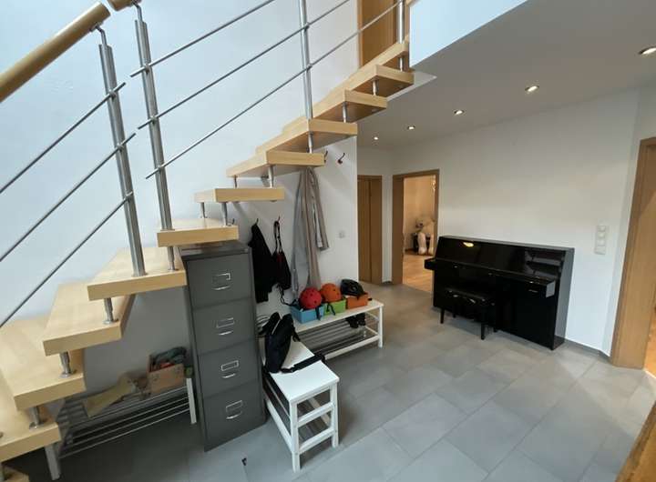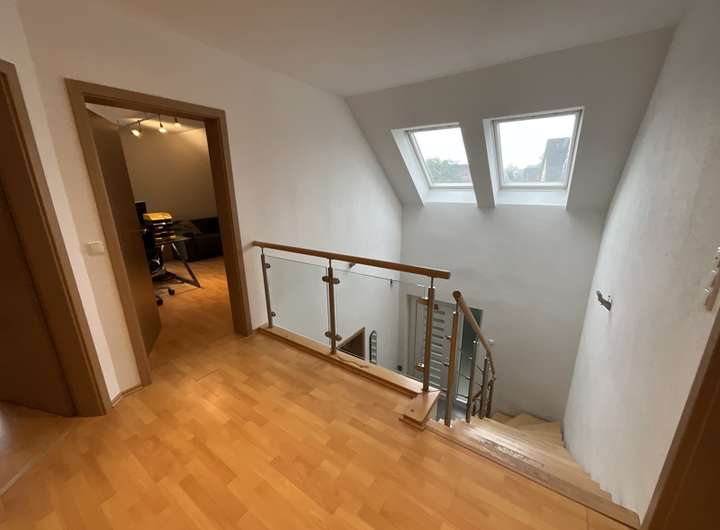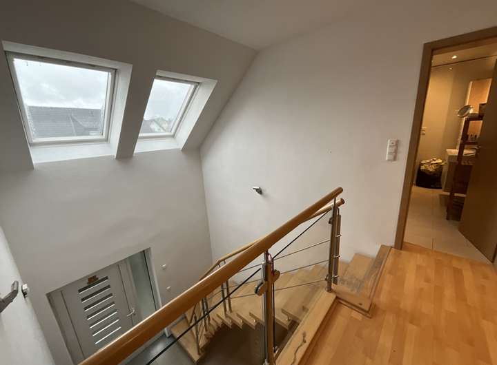 Über eine Stahltreppe mit Holzstufen erreichen Sie das Obergeschoss, wo Sie eine helle Galerie mit Blick in den Eingangsbereich des Erdgeschosses empfängt. Von der Galerie gelangen Sie in die drei geräumigen Schlafzimmer, die mit Laminat ausgelegt sind.