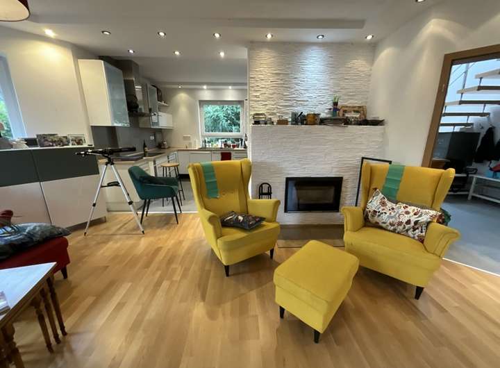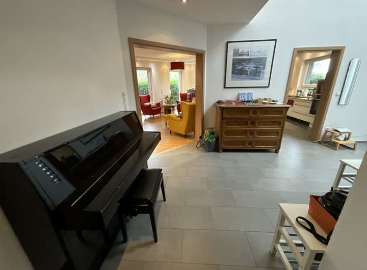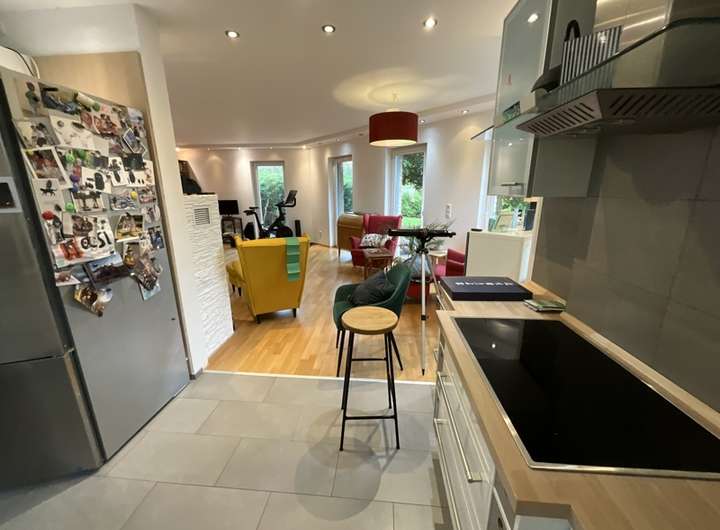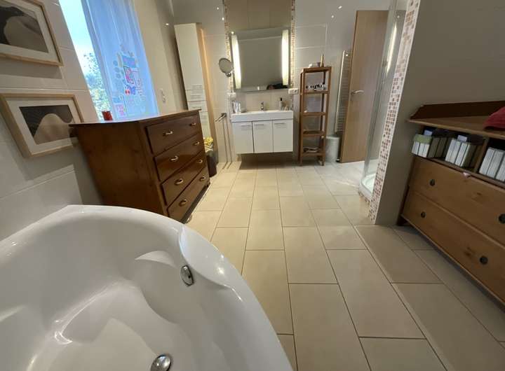 Das Haus verfügt über zwei Tageslichtbäder, die mit hochwertigen Badmöbeln ausgestattet sind, sowie eine moderne Einbauküche mit aktuellen Geräten.