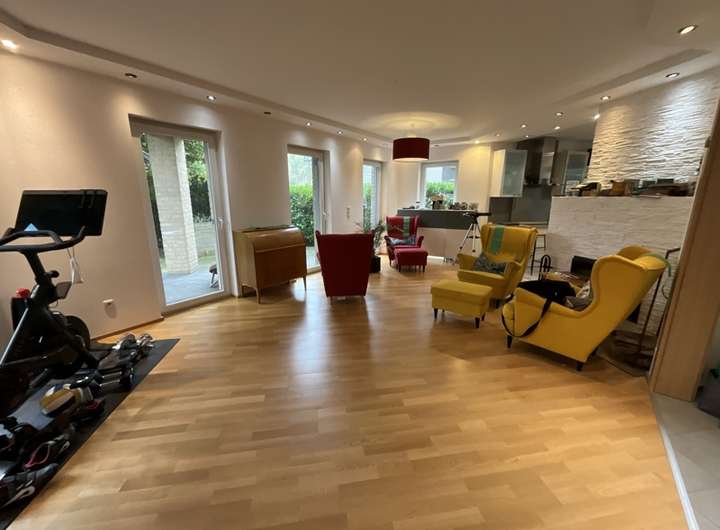 Das Wohnzimmer ist mit einem Parkettboden ausgestattet, während die restlichen Bereiche gefliest sind. Nahezu im gesamten Haus sind die Fenster bodentief gestaltet und mit elektrischen Rollläden versehen.