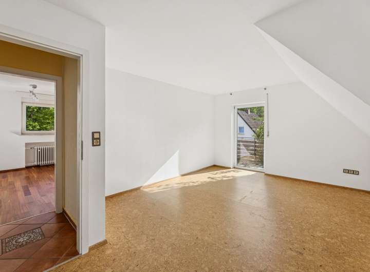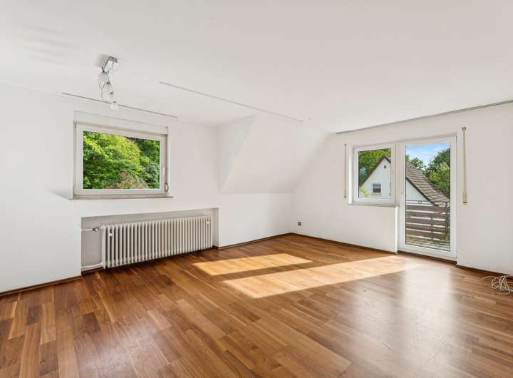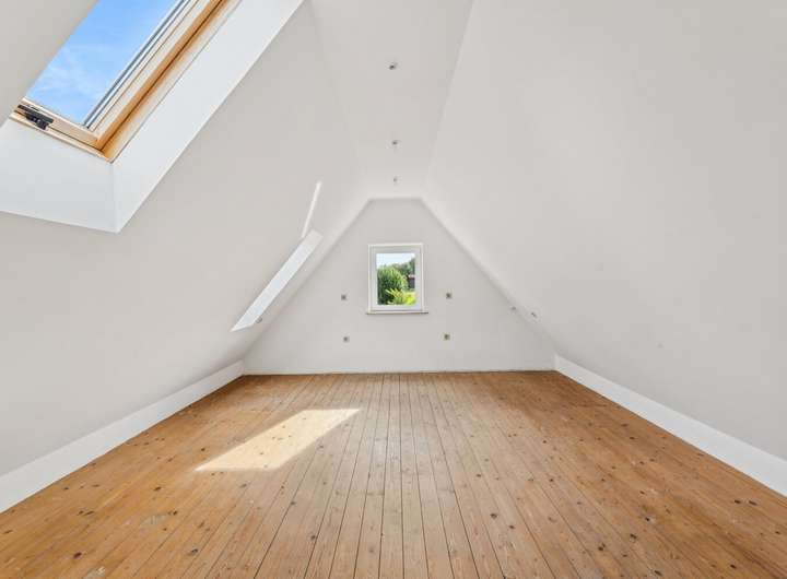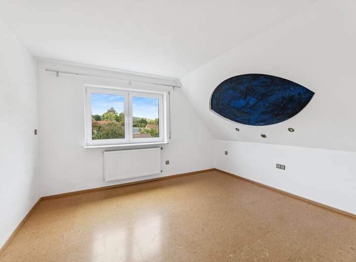 Der vollständig isolierte Spitzboden ist nahezu fertig ausgebaut und verfügt über einen kleineren sowie einen größeren Raum. Wasserleitungen wurden bereits für eine mögliche spätere Nutzung vorbereitet.
