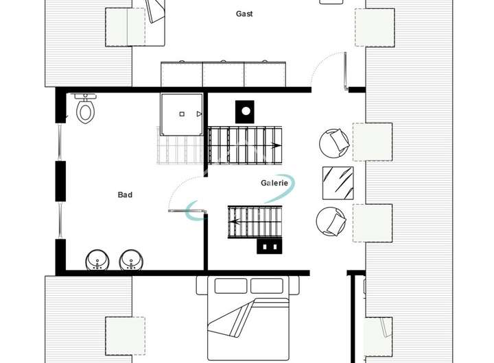 • Offene Holztreppe mit Edelstahlgeländer und Galerie im Dachgeschoss