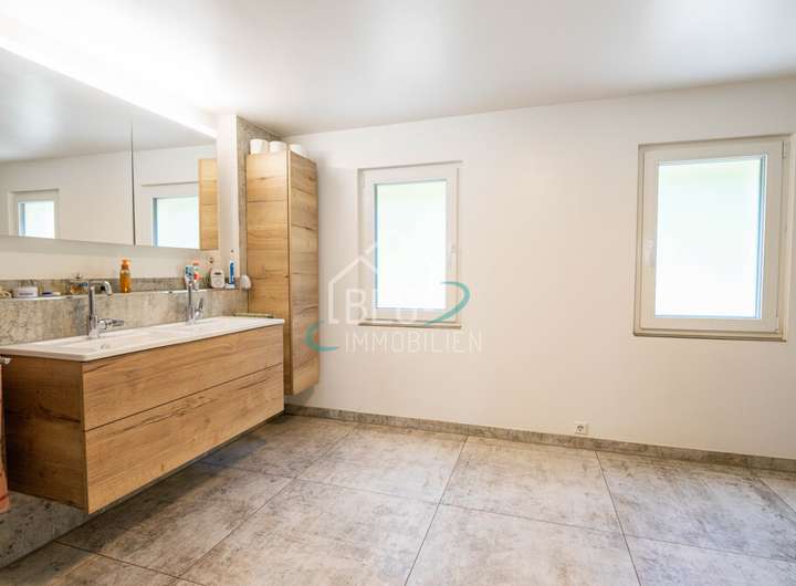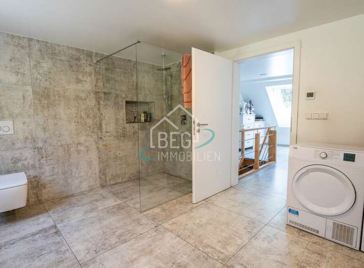 Die offene Wohnküche bietet den idealen Raum, um Ihre persönliche Traumküche zu gestalten – hier können Funktionalität und Gemütlichkeit ganz nach Ihren eigenen Vorstellungen entstehen. Im Dachgeschoss bieten freundlich gestaltete Schlafräume und ein großzügiges Bad mit bodentiefer Dusche sowie moderner Ausstattung einen Rückzugsort für die ganze Familie. Durch die helle Galerie und die offene Holztreppe entsteht ein luftiges, einladendes Wohngefühl. Das gesamte Haus ist geschmackvoll gestaltet, mit großen Fliesen, klaren Linien und warmen Holzelementen.