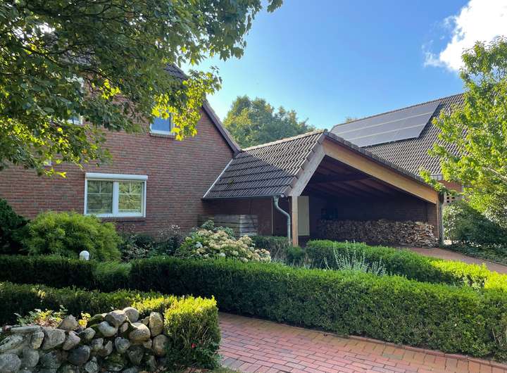 exklusives Wohnhaus mit Satteldach, sowie: Carport mit 2 Stellplätzen, Gartenpool mit Gartenhaus, 2 Abstellräume für Fahrräder und Gartengeräte;