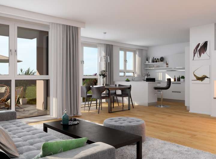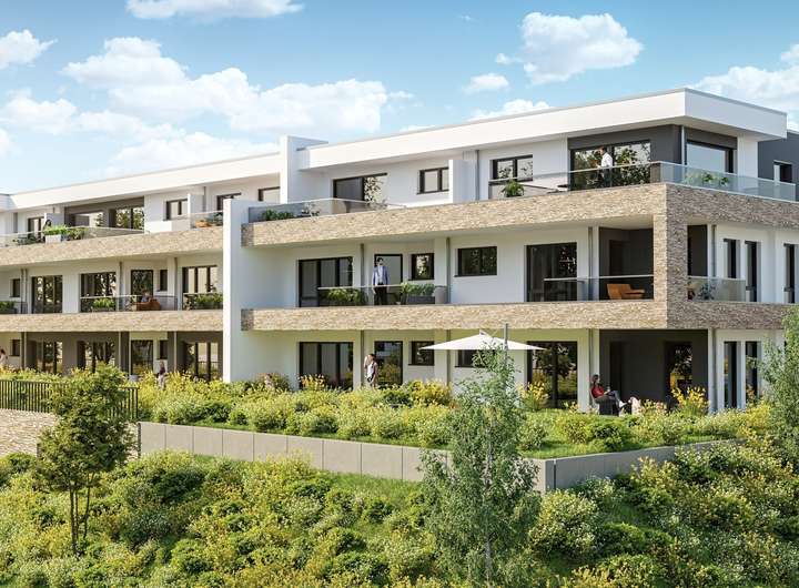 Das 3-geschossige Mehrfamilienhaus gewinnt durch die klare Gliederung der Fassade. Die Wohnungen überzeugen durch ihre gelungene Verbindung von Licht, Exklusivität und optimaler Nutzungsmöglichkeit. Die Wirkung der bodentiefen Fenster mit der feinen Unterteilung wird durch die transparenten Balkonbrüstungen unterstrichen. Farben, Formen und Materialien sind aufeinander abgestimmt. Eine besondere Atmosphäre entsteht in den Staffelgeschoss-Wohnungen.