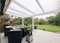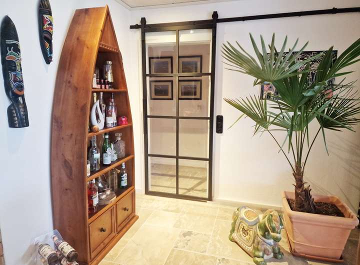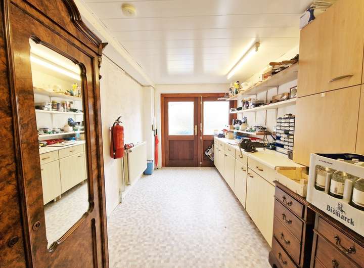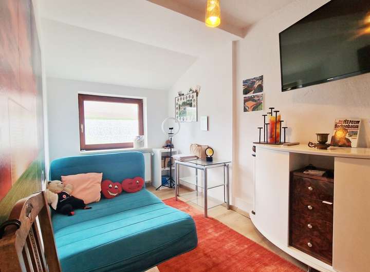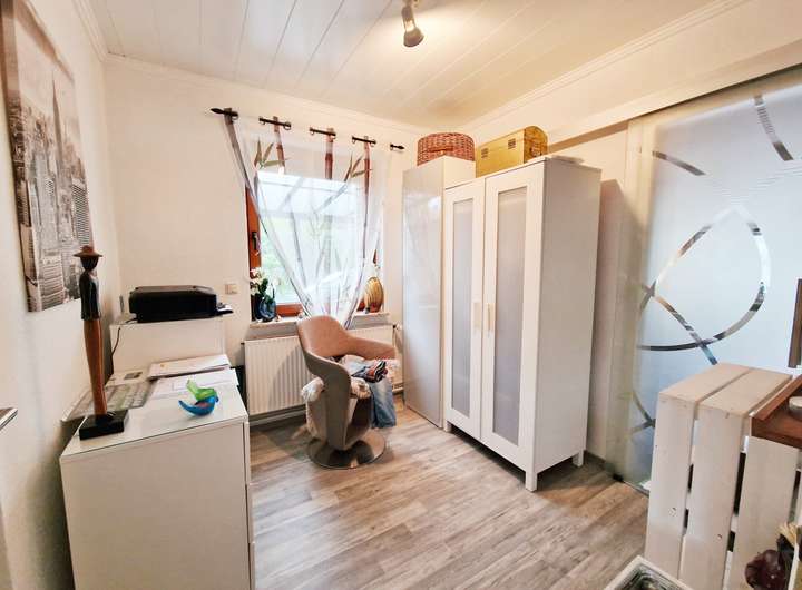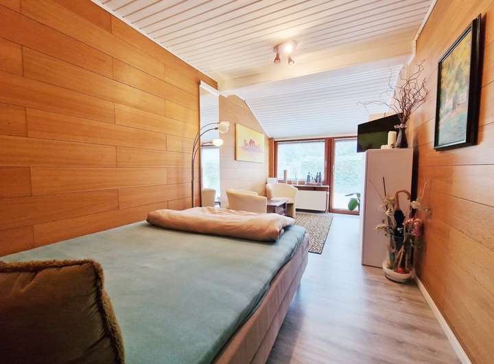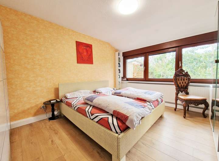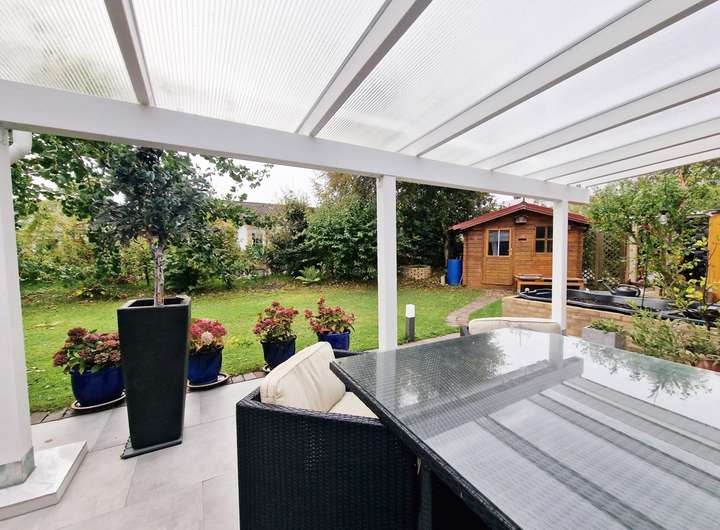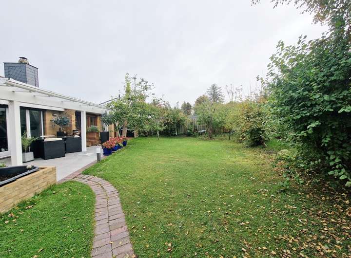 Besonders komfortabel ist der separate Gästetrakt auf der Westseite mit eigenem Zugang, Schlafzimmer, Ankleide und eigenem Duschbad – ideal für Besucher oder als ruhiger Arbeits-/Privatbereich. Auf der Ostseite gelangt man aus dem Haus direkt in die Garage mit angeschlossenem Werkraum und Hauswirtschaftsraum; von hier besteht zudem ein Zugang in den Garten. Weitere Abstellmöglichkeiten bietet der Dachboden. Das etwa 611 m² große Grundstück (Erbbaurecht) ist gepflegt angelegt und wird durch ein Gartenhaus sowie einen 2023 errichteten Carport ergänzt.