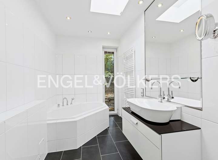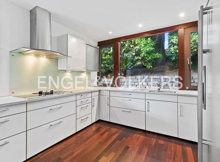 Vom Eingangsbereich aus erreichen Sie das geschmackvoll ausgestattete Gäste-WC mit Armaturen von Dornbracht sowie die helle, moderne Poggenpohl-Einbauküche. Diese lässt keine Wünsche offen: Ein amerikanischer Kühlschrank von LG, Miele-Geräte (Backofen, Mikrowelle, Elektro- und Gaskochfeld, Dunstabzug, Geschirrwärmer) und zahlreiche durchdachte Details machen diesen Bereich zu einem Highlight. Besonders praktisch ist der hüfthohe Durchbruch zum Essbereich, der einen schönen Blick in den Garten ermöglicht. Direkt angrenzend befindet sich der Hauswirtschaftsraum mit Waschmaschinen-/Trockneranschluss und Einbauschränken.