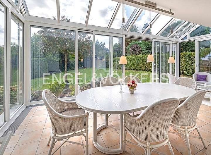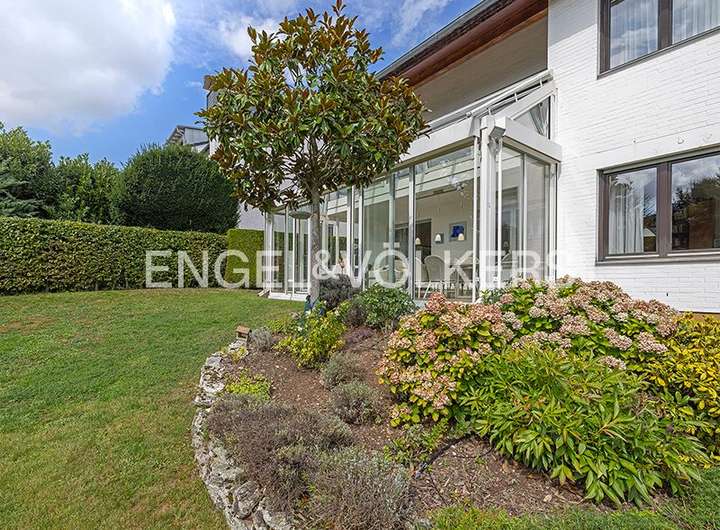 In schöner, ruhiger Lage von Bad Soden-Neuenhain liegt dieses gut geschnittene, komfortable Haus, das für eine Familie mit bis zu drei Kindern eine ideale Bleibe bietet. Die Wohnfläche verteilt sich auf zwei Etagen. Im Erdgeschoss bildet das großzügige Wohn-/Esszimmer mit anschließendem Wintergarten, der 2014 neu erstellt wurde, den Mittelpunkt des Familiengeschehens. Ein heimeliger Kamin steigert vor allen Dingen in den kälteren Monaten Ihr Wohlbefinden. Die praktische Einbauküche mit integrierter, kleiner Vorratskammer präsentiert sich hell und neuwertig. Ein weiteres Zimmer sowie ein modernes Duschbad komplettieren die Erdgeschossebene. Im Obergeschoss erwarten Sie fünf Zimmer, davon drei mit Zugang zum südseitigen Balkon. Das große, luxuriöse Masterbad ist mit begehbarer Dusche, Badewanne, Doppelwaschtisch und Dusch-WC ausgestattet. Sowohl das Wohnzimmer im Erdgeschoss als auch die Räume zur Südseite im Obergeschoss sind klimatisiert, was vor allem in sehr warmen Sommern ein großes Plus ist. Ein wohnlich ausgebauter Raum im Untergeschoss, ca. 30 m² groß und gut belichtet, bietet sich ideal als Family Room, Gym oder Gästebereich an, auch in Verbindung mit einem weiteren, hell ausgestatteten Duschbad. Üppige Nutz- und Stauflächen gibt es in drei großen Kellerräumen sowie auf dem Dachboden. Das schön eingewachsene Grundstück grenzt an die Gärten der umliegenden Nachbarn, sodass eine große, grüne Oase entsteht und somit maximale Privatsphäre gewährleistet ist. Im sonnigen Garten, sehr ansprechend und gleichzeitig pflegeleicht angelegt, wird der Aufenthalt im Freien für Groß und Klein zum Vergnügen. In zwei Garagen, mit neuen Sektionaltoren und Durchgang zum Garten, sind Ihre Fahrzeuge sicher untergebracht. Von der wertigen Bausubstanz, dem hervorragenden Pflegezustand der Immobilie, den kontinuierlich vorgenommenen Renovierungen und der Sanierung der Bäder und Küche werden Sie begeistert sein. Mit relativ geringem Aufwand lassen sich weitere Anpassungen des Hauses an die heutigen Ansprüche und den Zeitgeschmack vornehmen. Wenn Sie einen klaren Grundriss mit viel Platz, einen wunderbaren Garten und eine ruhige Familienlage mit idealer Anbindung in alle Richtungen zu schätzen wissen, haben Sie Ihre Traumimmobilie gefunden!
