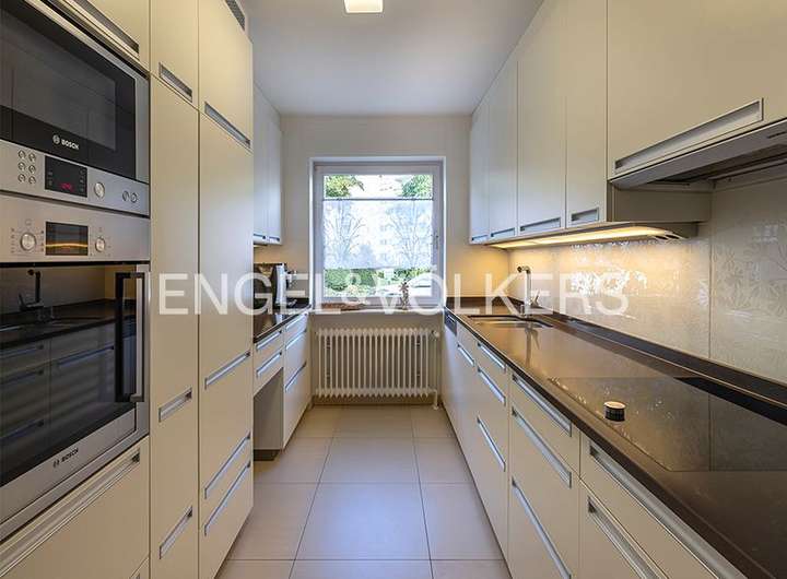 Arbeitszimmer Einbauküche Split Klimaanlage Blick ins Grüne Parkett Fliesen Teppich Vollunterkellert Kamin