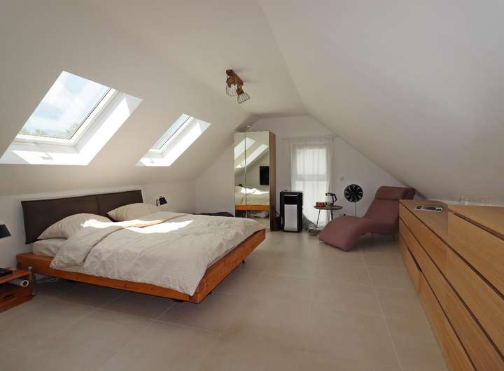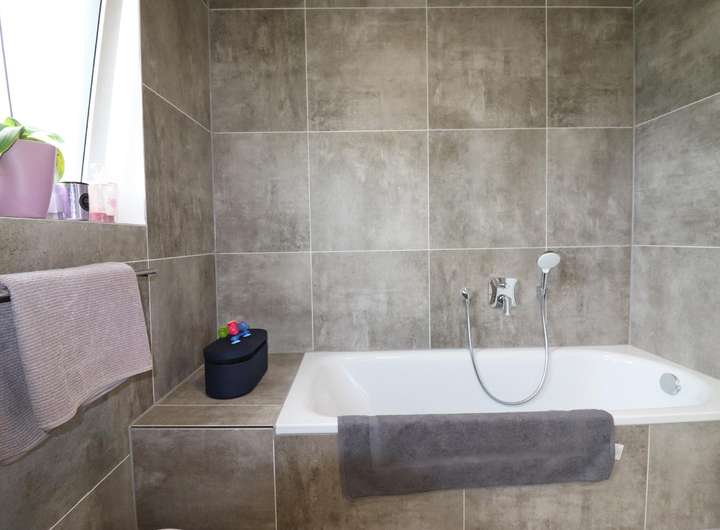 Das Obergeschoss verfügt über zwei helle Kinderzimmer sowie ein Badezimmer mit Dusche. Im Dachgeschoss erwartet Sie ein weiteres Badezimmer mit Badewanne – perfekt für entspannende Stunden – sowie ein großzügiges Elternschlafzimmer. Das Erscheinungsbild wird durch das klassische Satteldach ergänzt, das dem Haus eine zeitlose Ausstrahlung verleiht.
