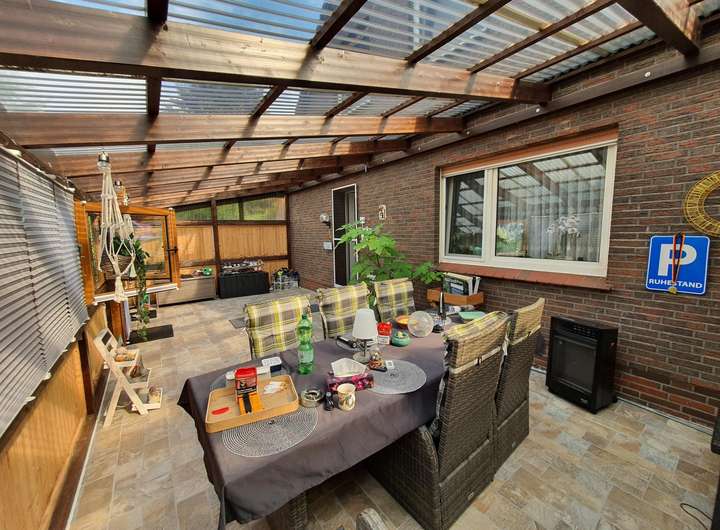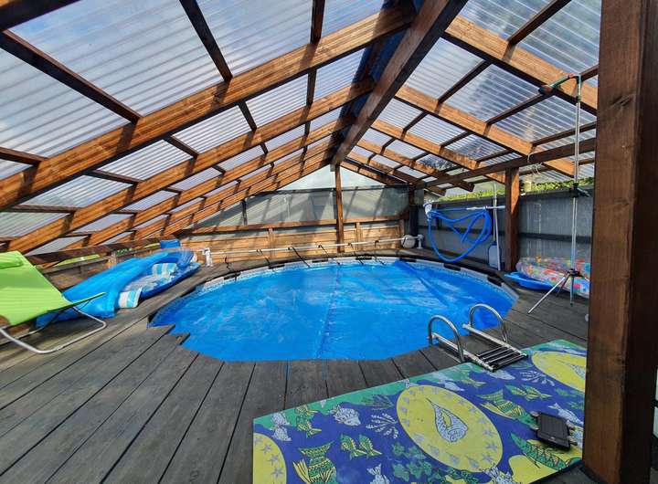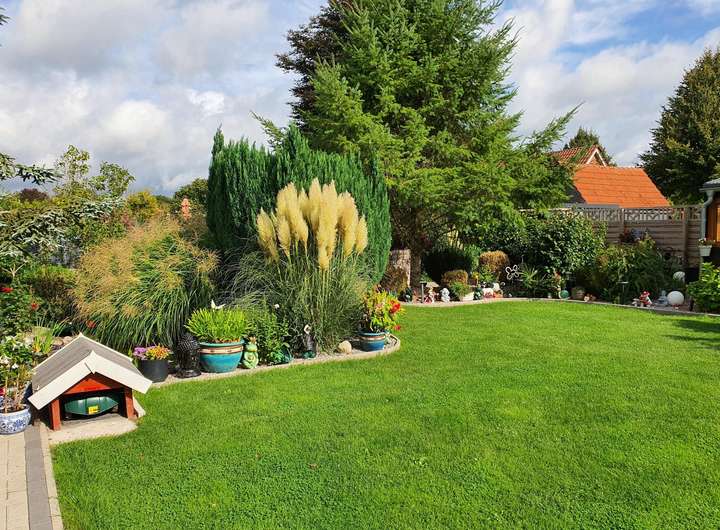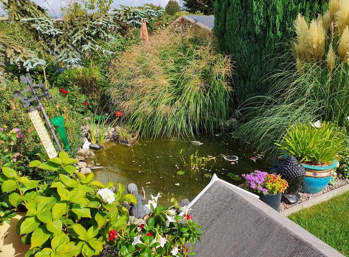 Zur Immobilie gehört ein wunderschöner Garten mit kleinem Teich, ein Gartenblockhaus mit Grillplatz (von 2025), ein überdachter und geschützter Pool, ein Gewächshaus, eine 3-Fach-Garage (Holzbauweise) sowie eine Massivgarage mit angrenzendem Geräteschuppen.