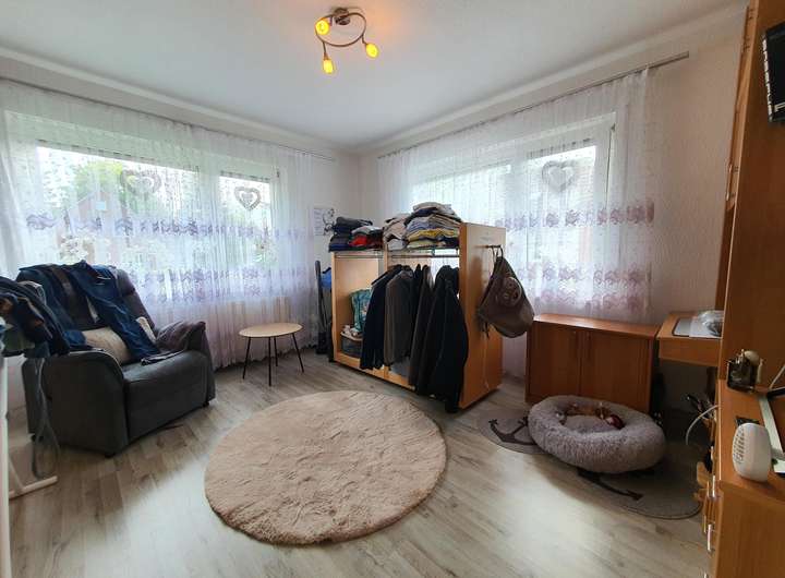 Das kleinere Siedlungshaus mit ca. 80 m² Wohnfläche verfügt im Erdgeschoss über ein Wohnzimmer, ein Schlafzimmer, eine Küche mit Küchenzeile und angrenzendem Heizungs-/ Abstellraum sowie Teilkeller, ein modernes Tageslichtbad mit Dusche und Wanne sowie einem Flur mit Terrassenzugang (überdachte Terrasse)