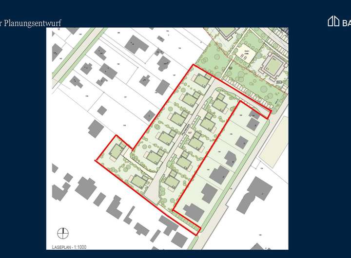 Das Grundstück mit vorliegendem Bebauungsplan für über 4.000 m² BGF soll als Einfamilienhaussiedlung mit 12 Einfamilienhäusern entwickelt werden. Zusätzlich sind auf dem Grundstück 24 Parkplätze (2 je EFH) sowie 9 Besucherstellplätze vorgesehen.