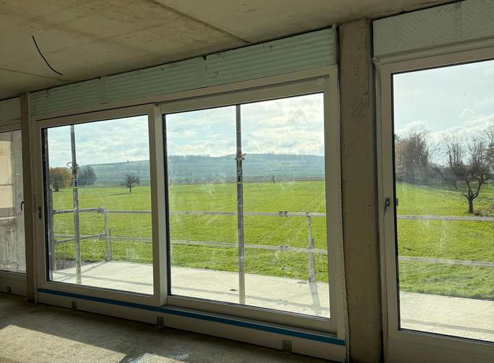 Ein echtes Highlight ist der großzügige Balkon, der einen fantastischen Panoramablick über die angrenzenden Felder bis hin zum Menfelder Kopf eröffnet. Große Fensterelemente durchfluten die Räume mit Tageslicht und schaffen ein offenes, luftiges Wohngefühl.