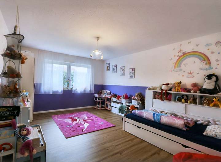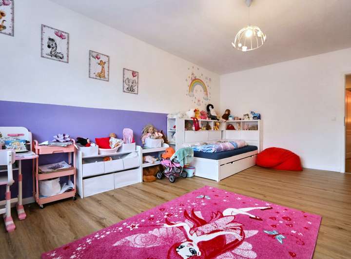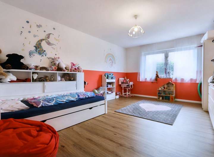Die Raumaufteilung des Hauses überzeugt durch eine sinnvoll gestaltete Organisation: Sieben helle Zimmer stehen unterschiedlichsten Lebenssituationen zur Verfügung – ganz gleich, ob ein separates Arbeitszimmer, ein Gästezimmer oder zusätzliche Rückzugsorte benötigt werden. Im Untergeschoss erwartet Sie ein großzügiger Hobbyraum, der sich vielseitig nutzen lässt, etwa als Fitnessbereich, Heimkino oder zweite Spielebene für Kinder. Zwei modernisierte, geschmackvoll ausgestattete Badezimmer bieten sowohl Funktionalität als auch Komfort für größere Familien oder Besucher.