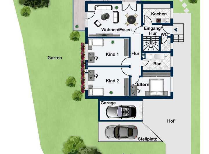 Das Grundstück bietet neben der großzügigen Rasenfläche viel Raum für Freizeitaktivitäten. Ein neues Mehrzweckspielgerät lässt Kinderherzen höher schlagen und bietet zahlreiche Spielmöglichkeiten im eigenen Garten. Für Ihr Fahrzeug stehen eine Garage sowie zwei weitere Stellplätze zur Verfügung – auch Gäste finden hier problemlos Platz.