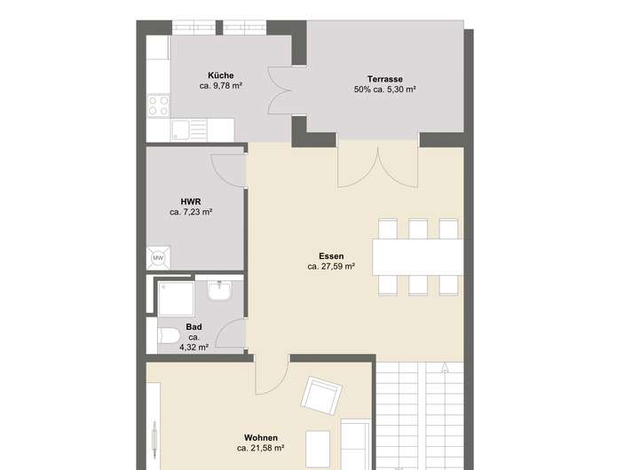 Das Herzstück des Hauses ist der großzügige Essbereich mit offener Küche und direktem Zugang zur großen Terrasse. Hier befindet sich auch das separate Wohnzimmer, sodass die Gerüche beim Kochen im Ess- und Kochbereich verbleiben. Ein Duschbad sowie ein Hauswirtschaftsraum runden diese Ebene ab.