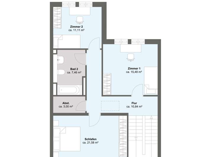Hier befinden sich drei Schlafzimmer unterschiedlicher Größe, die sich flexibel als Kinder-, Eltern- oder Arbeitszimmer nutzen lassen. Ein modernes Bad mit einer Badewanne sowie ein Abstellraum komplettieren das Geschoss. Hier befindet sich noch ein zusätzlicher kleiner Balkon, um im Alltag noch mal tief durchatmen zu können.