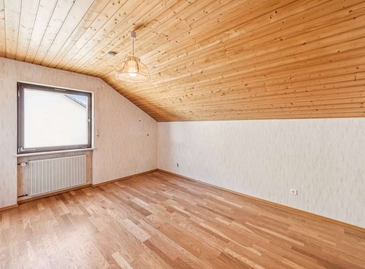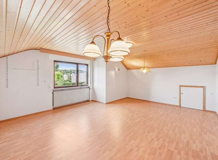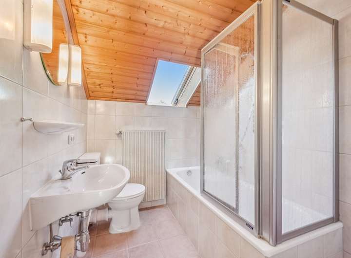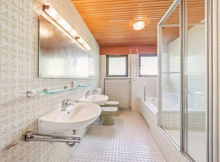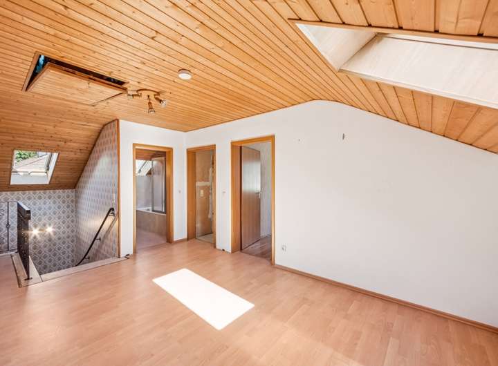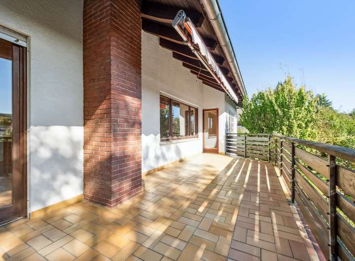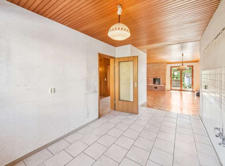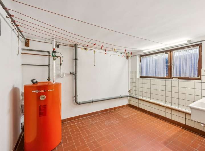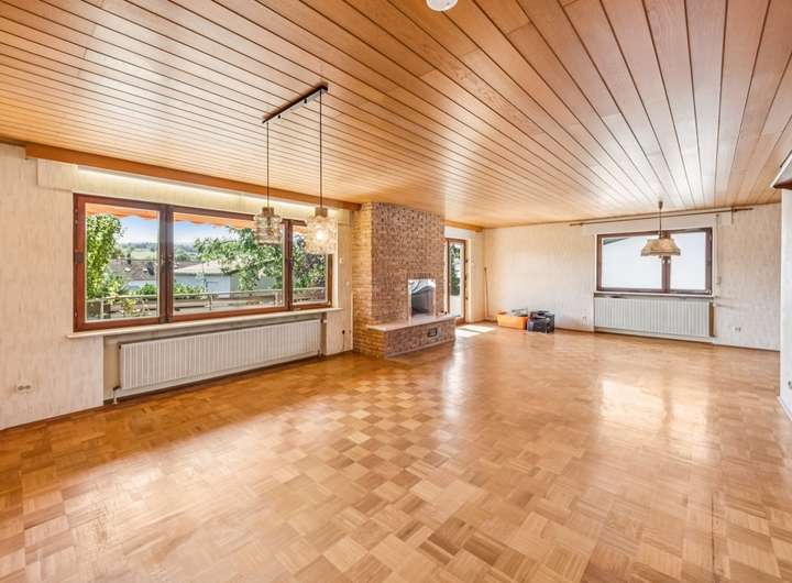 - Fenster: überwiegend Holzrahmen mit Doppelverglasung aus dem Baujahr, im Wohn- und Essbereich teils bodentief mit Austritt zur Terrasse - Heizung: Öl-Zentralheizung aus dem Baujahr 1990, Wandheizkörper, zentrale Warmwasseraufbereitung für EG und OG - Bad: im EG mit Dusche und Badewanne, zwei Waschbecken und WC, im OG mit Waschbecken, Badewanne, WC - Separates Gäste-WC im EG - Bodenbelag: Eichenparkett in den Wohnräumen im EG, Fliesen im Eingangsbereich, im OG: Laminatboden, im UG: teils Fliesen, teils Rohboden im nicht ausgebauten Bereich - Wandbelag: überwiegend tapeziert, teils gestrichen - Kamin im Wohnzimmer - großzügige Terrasse zum Garten hin - Dach: Holzdachstuhl, eingedeckt mit Dachpfannen, Zwischensparrendämmung vorhanden; Dacheindeckung ca. 35 Jahre alt