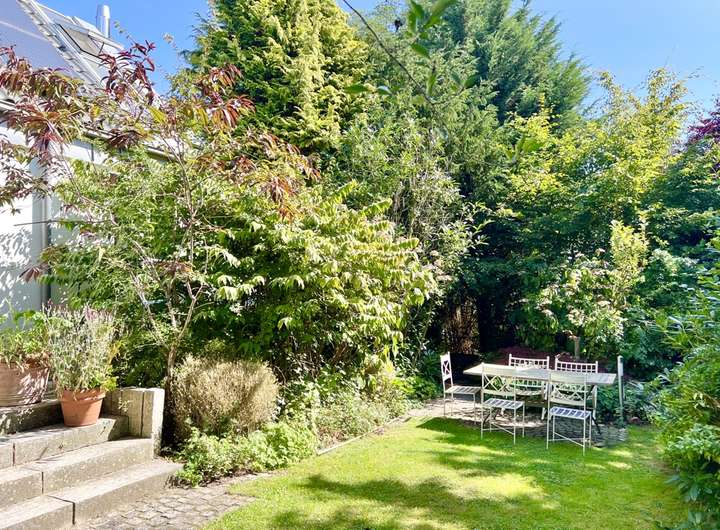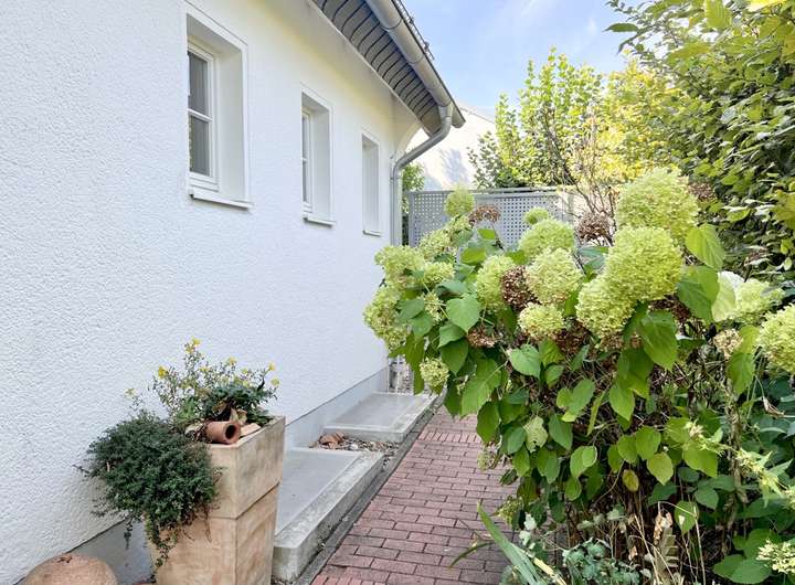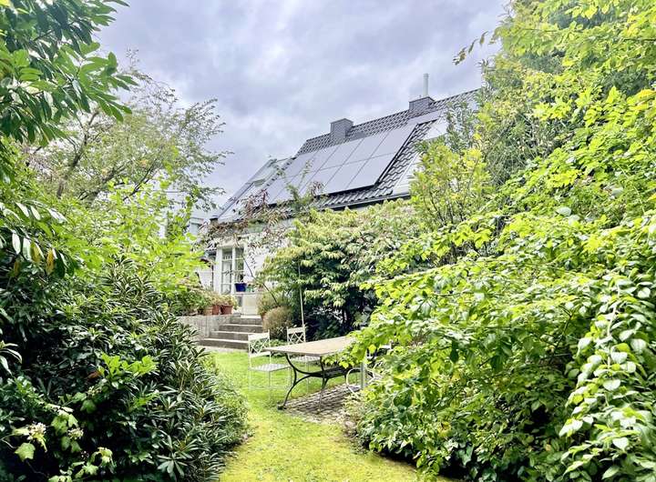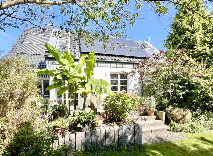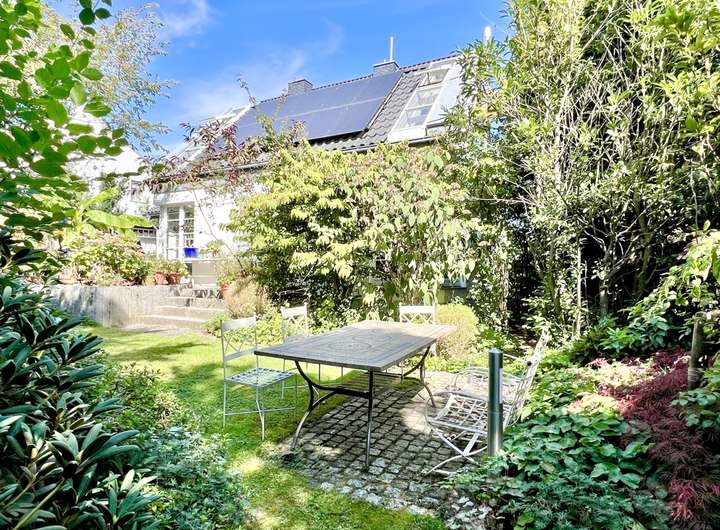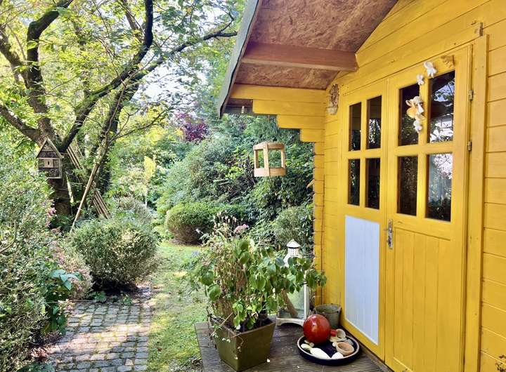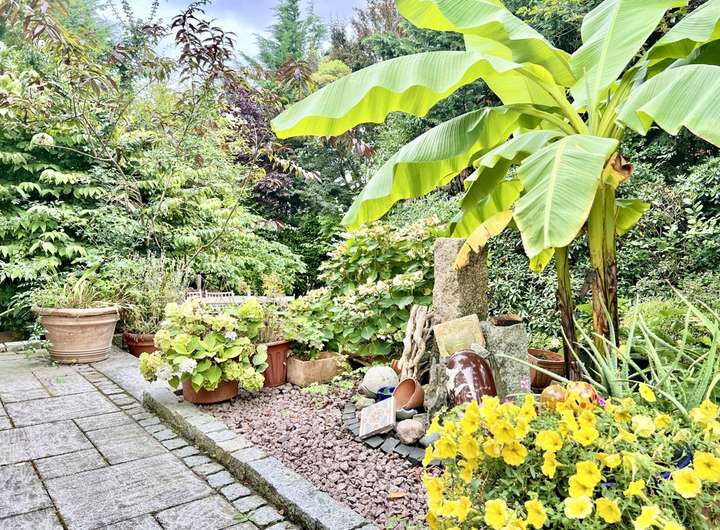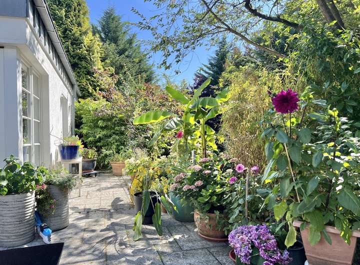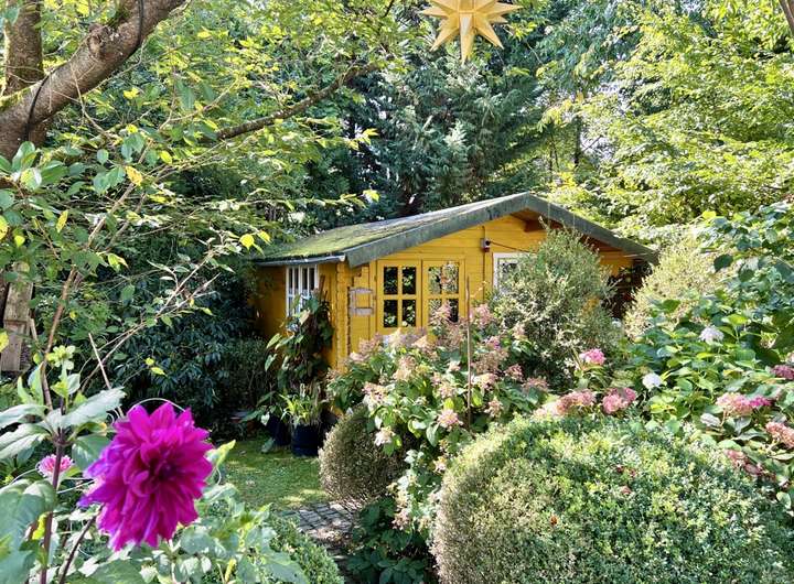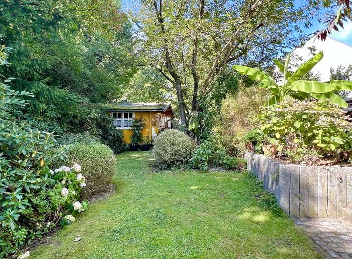 Das Grundstück ist ein echtes Paradies: Üppig angelegt mit Stauden, Rosen, Hortensien, exotischen Pflanzen wie Bananengewächsen, sowie Hecken und Sträuchern. Verschiedene Ebenen mit Natursteinmauern und Sitzplätzen schaffen eine abwechslungsreiche Gartenarchitektur. Ein gelbes Gartenhaus mit Sauna und Außendusche macht den Außenbereich zur privaten Wellness-Oase.