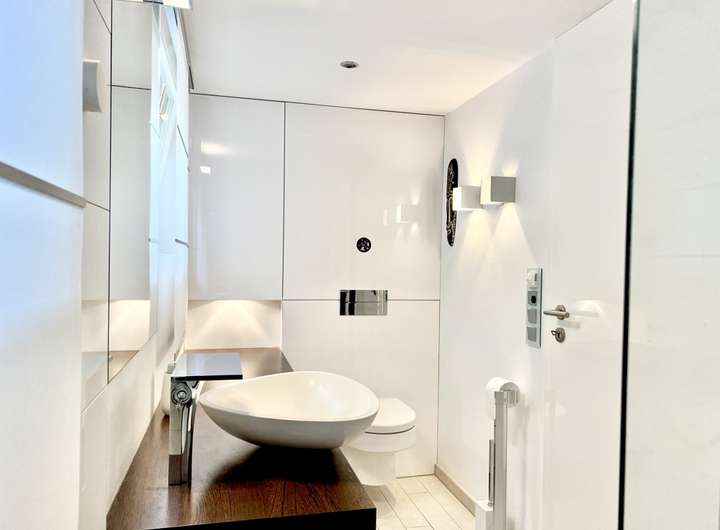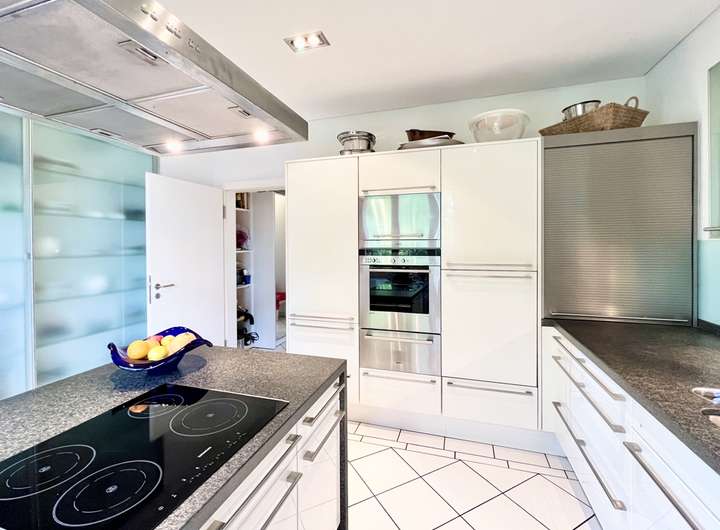 Von hier aus gelangt man in die moderne Küche: Die Küche ist hell und durchdacht mit weißen Hochglanzfronten, Glas- und Schiebetüren, Edelstahlakzenten, einer Kochinsel mit Induktionsfeld und reichlich Tageslicht. Hier vereinen sich Funktionalität und Design.