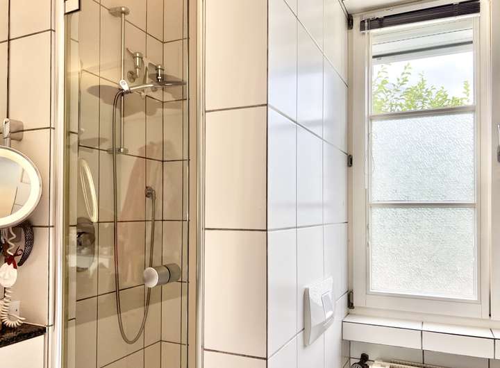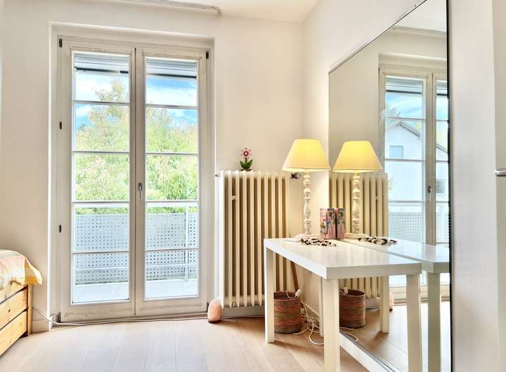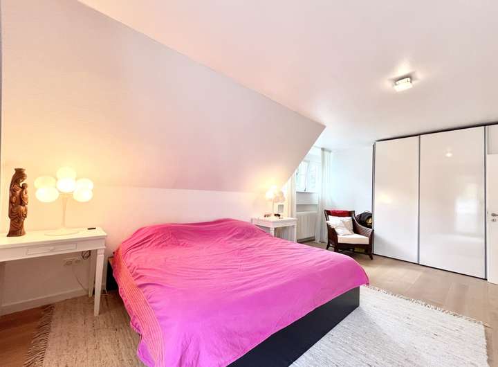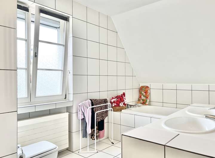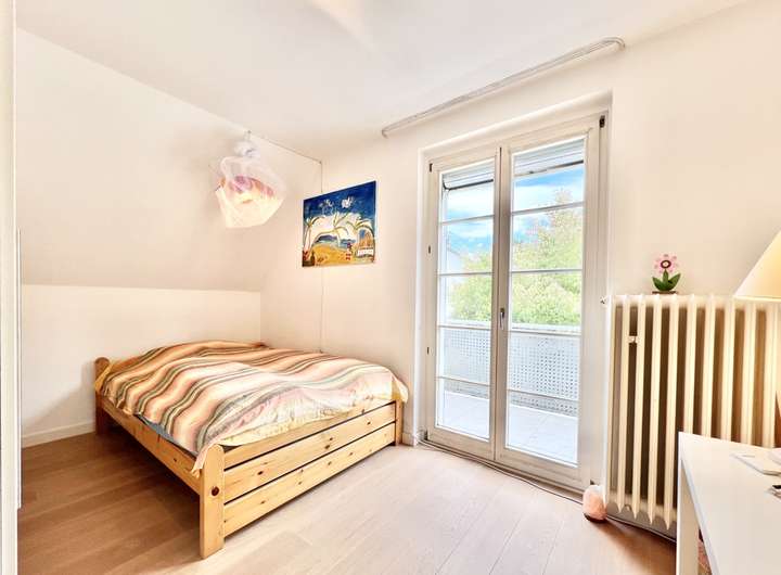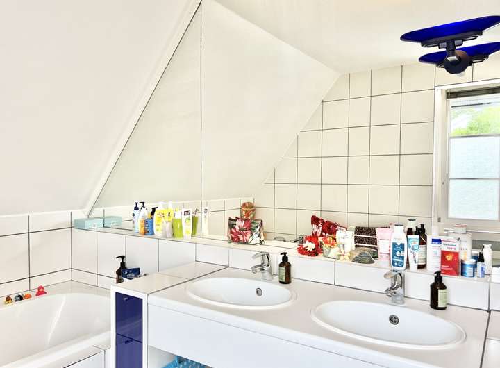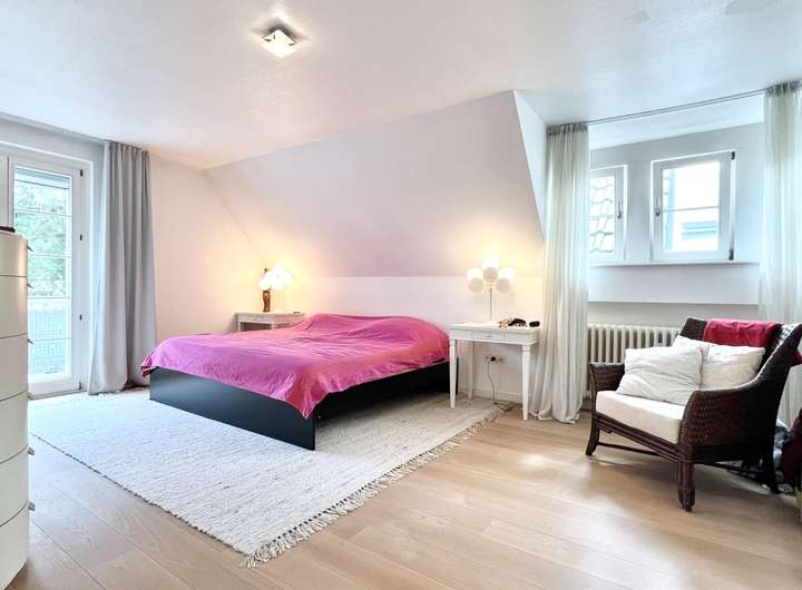 Im Obergeschoss befinden sich 3 geräumige Schlafzimmer, sowie ein zusätzlicher, kleinerer Raum, der sich als Ankleidezimmer eignet. Zwei der Schlafzimmer haben einen direkten Zugang über bodentiefe Fenstertüren zum Balkon. Große Einbauschränke schaffen im Obergeschoss reichlich Stauraum. Das große Vollbad bietet Wanne, Dusche und Tageslicht, ist großzügig geschnitten und vereint Komfort mit einem zeitlosen Design.