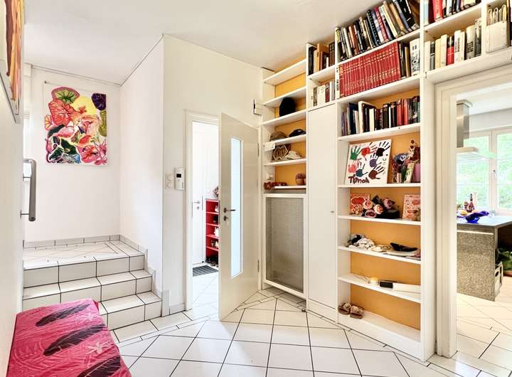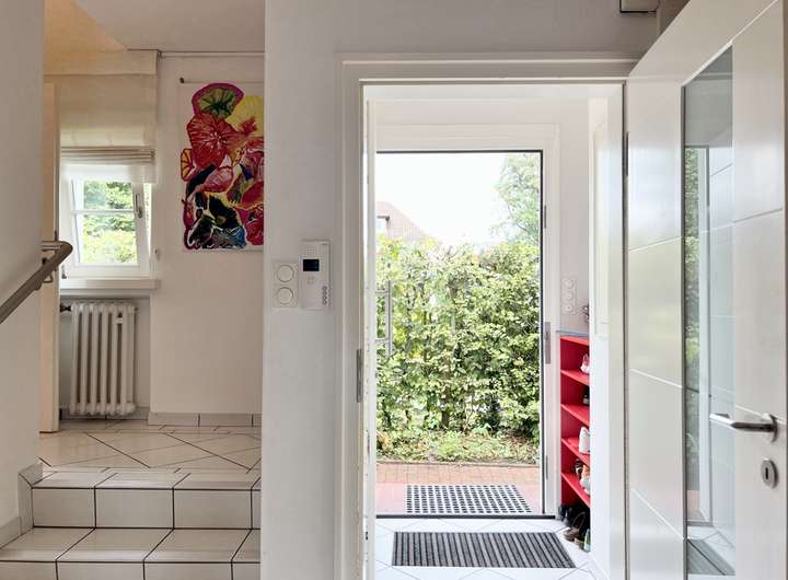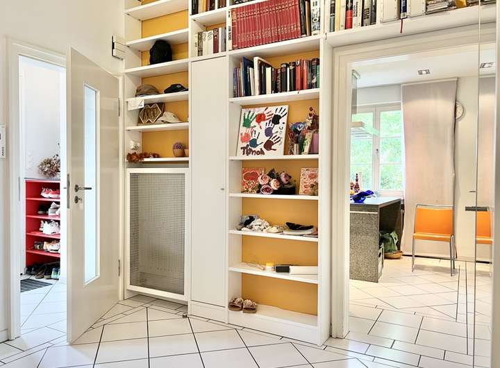 Der Eingangsbereich empfängt Sie mit einem kleinen Windfang und anschließend mit einem hellen und großen Flur – in dem Platz für eine Garderobe ist und Stauraum in hochwertigen Einbauschränken und Regalen.