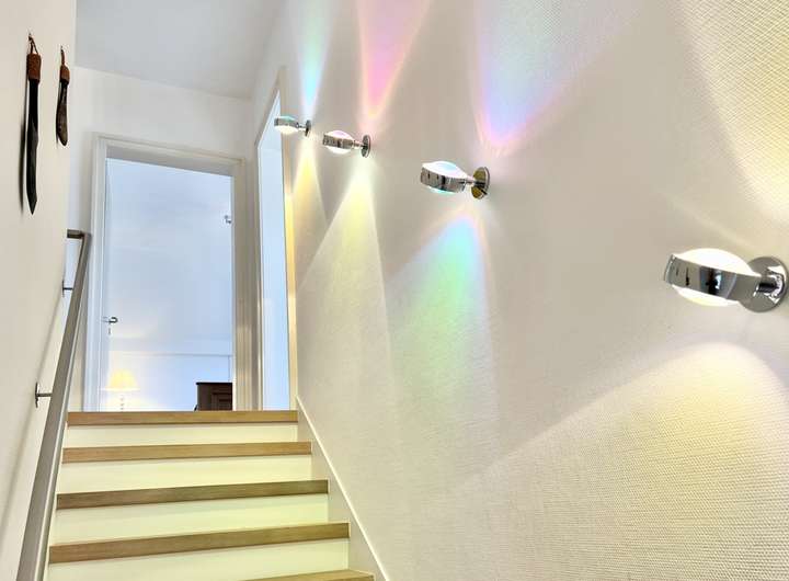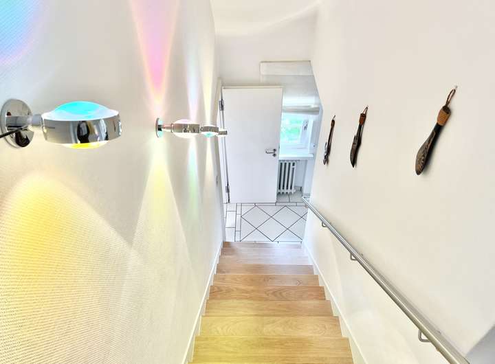 Die Treppe ins Obergeschoss ist ein echter Hingucker mit Holzboden und modernen Wandlampen. Diese schaffen eine warme und gemütliche Atmosphäre auf dem Weg zu den Räumen im Obergeschoss.