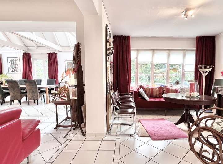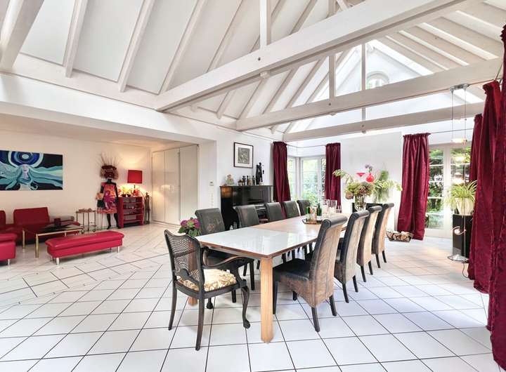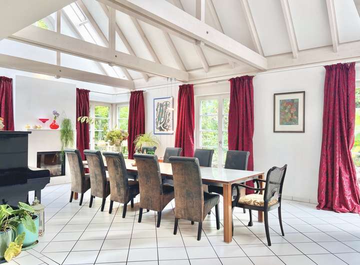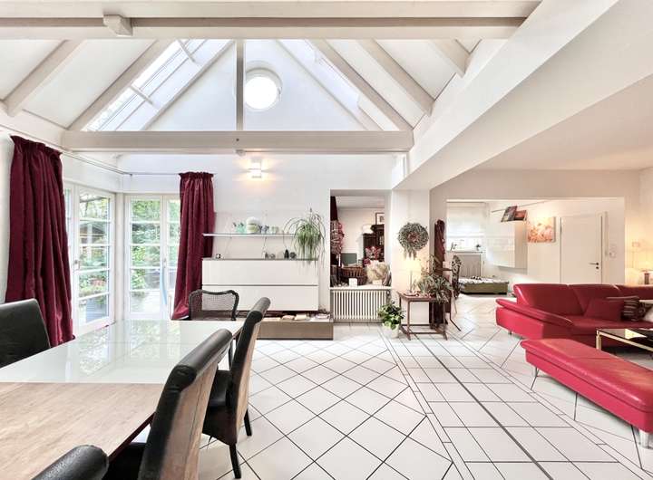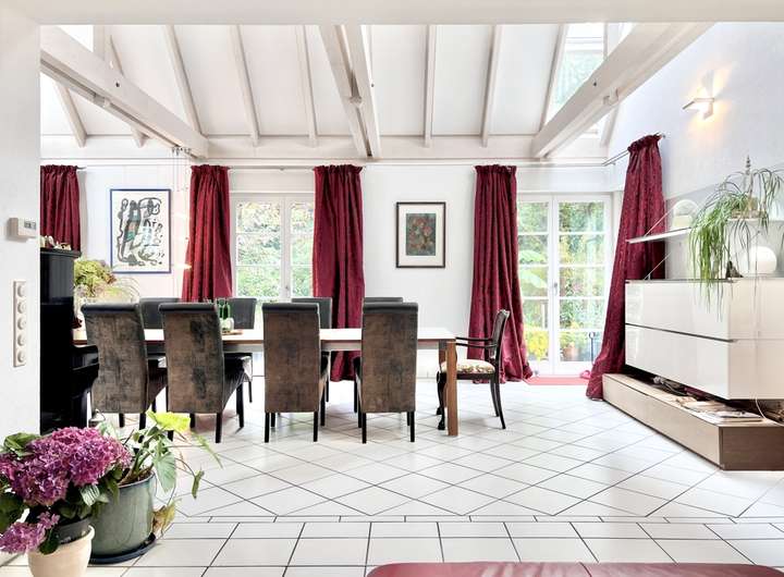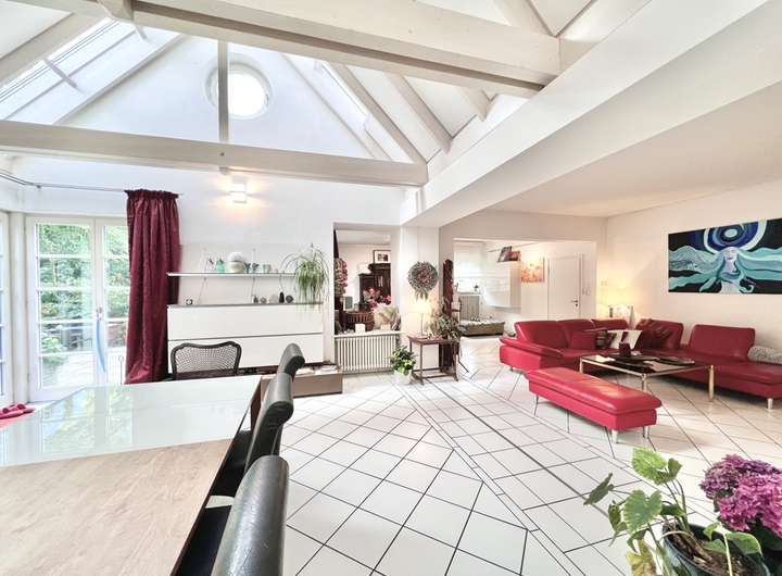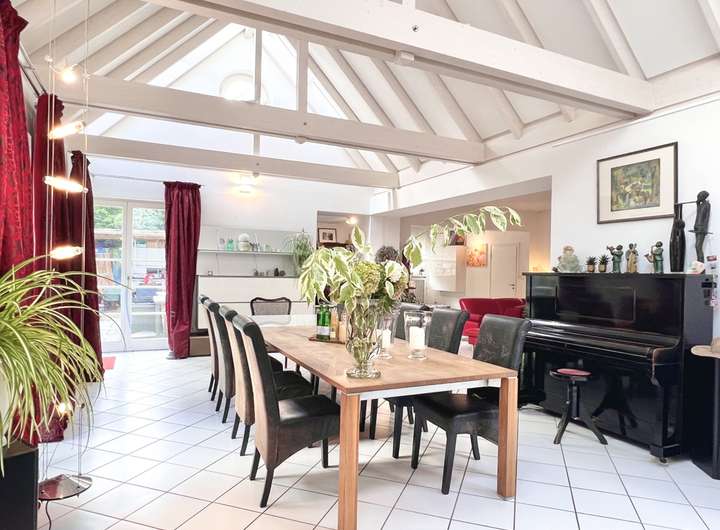 Über den Flur erreicht man den hellen Wohn- und Essbereich mit beeindruckender Größe und Offenheit. Der Anbau von 1997 schafft Loft-Charakter mit hohen Decken und sichtbaren Balken. Die großen Fensterfronten bringen Licht ins Haus und verbinden das Innere mit dem wunderschönen Garten. Eine Fußboden- und Wandheizung, sowie ein Kaminofen sorgen für Behaglichkeit.