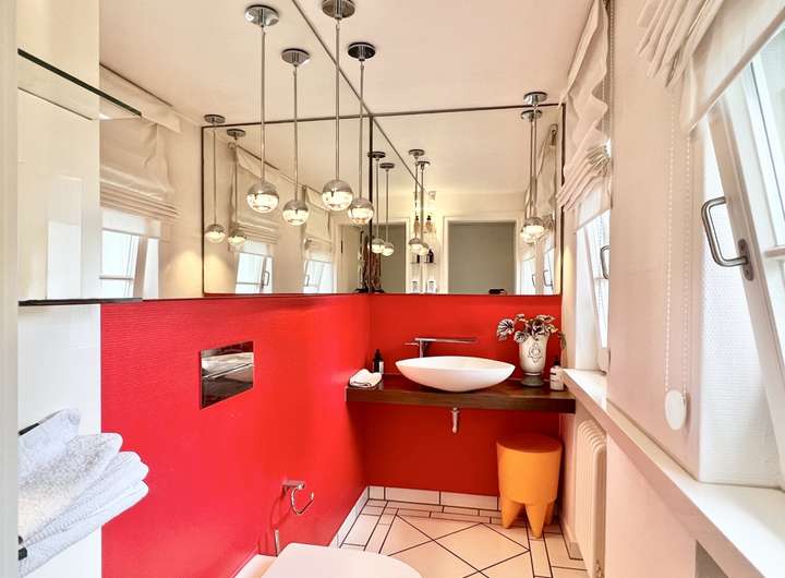 Über die Treppe zum Obergeschoss erreicht man auf einer Zwischenebene das Gäste-WC, das mit seiner roten Akzent- und Spiegelwand, modernen Pendelleuchten und Designerwaschtisch ein echtes Statement setzt.