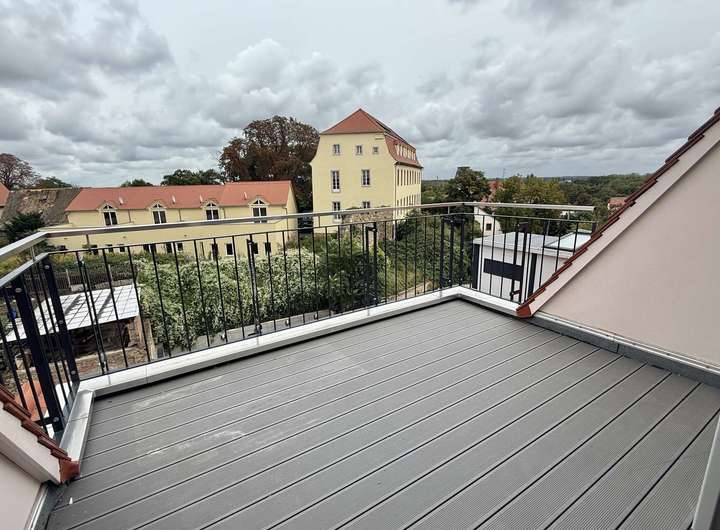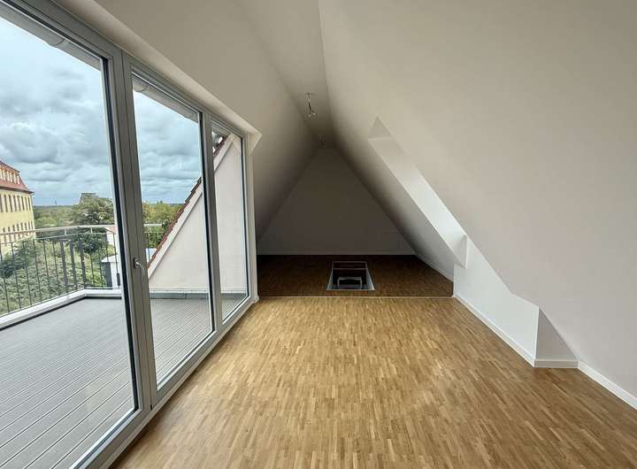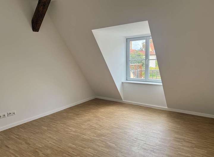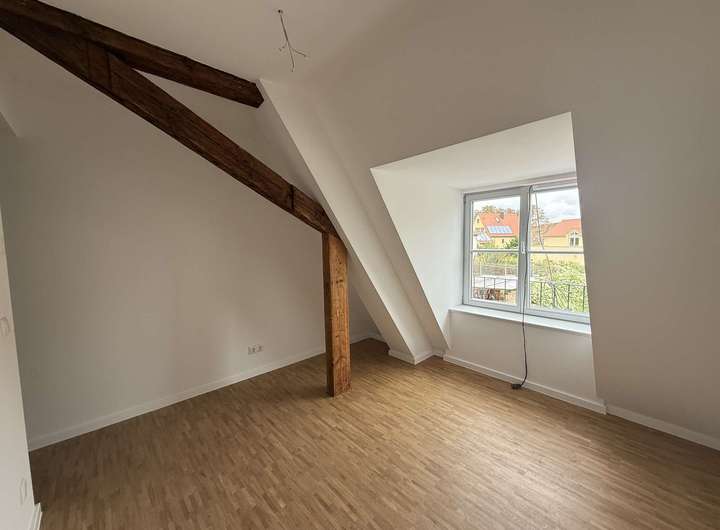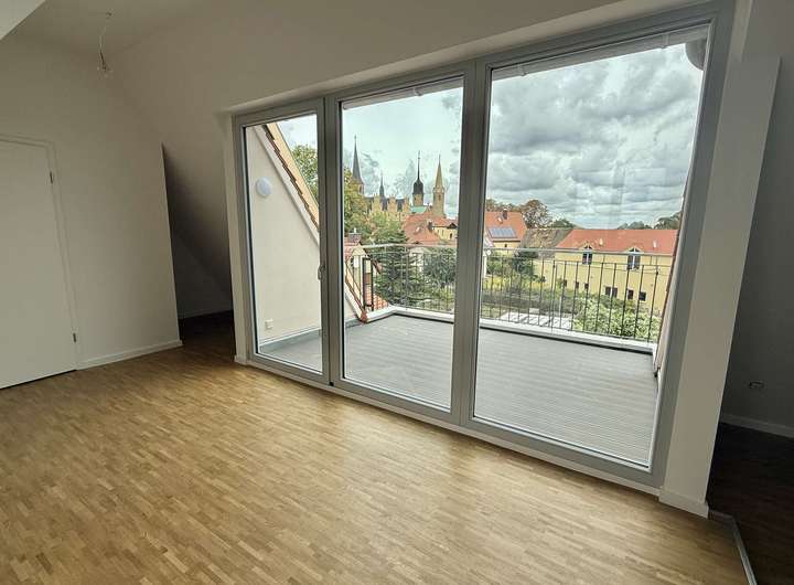 Über eine elegante Treppe gelangen Sie in das Herzstück der - ein lichtdurchflutetes Wohnzimmer oder auch Schlafzimmer, das mit seiner Großzügigkeit und seinem Charme begeistert. Von hier aus haben Sie direkten Zugang zu einer einladenden Terrasse, die zu gemütlichen Stunden im Freien einlädt und einen idyllischen Rückzugsort bietet und einen fabelhaften Blick auf den Dom bietet. In dieser Etage befindet sich ebenfalls noch ein Gäste-WC.