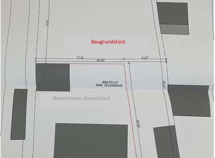 Verkauft wird ein Baugrundstück in ruhiger & zentraler Lage in 97464 Niederwerrn. Das Grundstück ist ca. 622 Quadratmeter groß. Dabei entfallen ca. 422 Quadratmeter auf die Fläche für den Bau eines Hauses und ca. 200 Quadratmeter auf die sehr breite Zufahrt (8 Meter Breite). Daher eignet sich die Zufahrt bestens für eine Garage, einen Stellplatz und ein Carport. Die Erschließung erfolgt durch den Käufer. Es steht bereits eine große Garage auf dem Grundstück die mit verkauft wird und genutzt oder abgerissen werden kann. Die Bebaubarkeit richtet sich in Abstimmung mit der Gemeinde und dem Landratsamt nach der Nachbarbebauung und lässt eine Bebauung von 2 Vollgeschossen + Dachgeschoss zu.