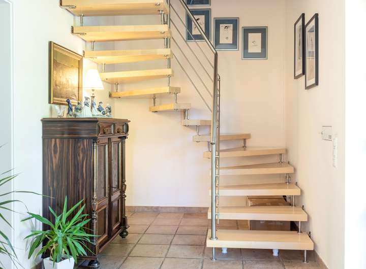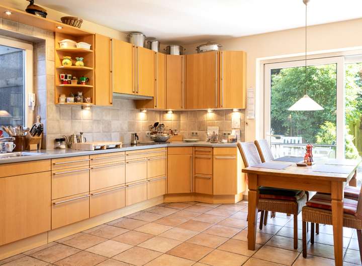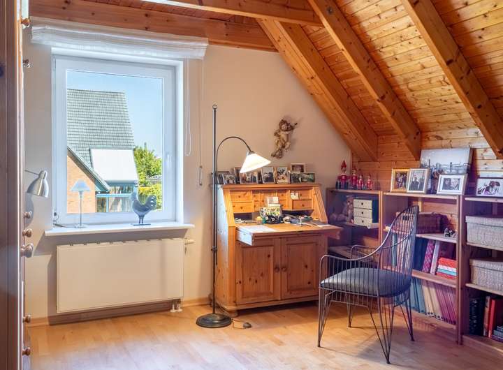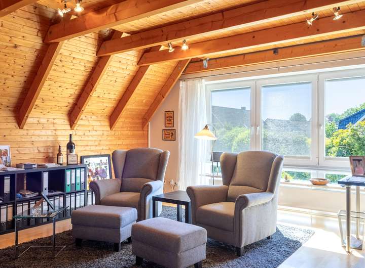 Dieses moderne und sehr gepflegte Architektenhaus aus dem Jahr 2003 bietet auf ca. 211 m² Wohnfläche ein durchdachtes Wohnkonzept für Menschen mit Anspruch an Design, Funktion und Raumgefühl. Auf einem ca. 960 m² großen Grundstück in ruhiger, angenehmer Nachbarschaft überzeugt das Haus mit klarer Architektur, hochwertiger Ausstattung und großzügiger Raumaufteilung. Dank seiner durchdachten Raumaufteilung und vielseitigen Nutzungsmöglichkeiten bietet dieses Haus den idealen Rahmen für Familien, Paare sowie für die Kombination von Wohnen und Arbeiten unter einem Dach. Bereits beim Betreten der Diele mit ca. 2,60 m Deckenhöhe fällt der offene, helle Charakter des Hauses auf. Von hier führt die freitragende Kenngott-Treppe ohne Wangen ins Obergeschoss, wo sich vier großzügige Wohnräume und ein geräumiges Vollbad befinden. Über eine Spindeltreppe gelangen Sie weiter ins ausgebaute Dachgeschoss – ein echtes Highlight der Immobilie: Hier erwarten Sie eine hochwertige Klafs-Sauna, ein Fitnessbereich sowie zusätzliche Fläche zur individuellen Nutzung. Im Erdgeschoss überzeugt der offene Wohn-/Essbereich mit einem modernen Biofire-Kachelofen, Gäste-WC und hochwertig verlegten Fliesen im Fugenschnitt. Drei Terrassen – eine davon überdacht – sowie eine großzügige Rasenfläche mit Gartenhütte schaffen beste Voraussetzungen für entspannte Stunden im Freien. Abgerundet wird das Angebot durch zahlreiche hochwertige Details wie eine Gasheizung aus 2021, Kupferverkleidungen an Gauben und Schornstein, einer Aufsparrendämmung, Glasfaseranschluss sowie einen praktischen Doppelcarport direkt am Haus. Ein Haus mit Charakter, Komfort und klarer Linie – ideal für Familien oder Paare mit Platzbedarf und Stilbewusstsein.