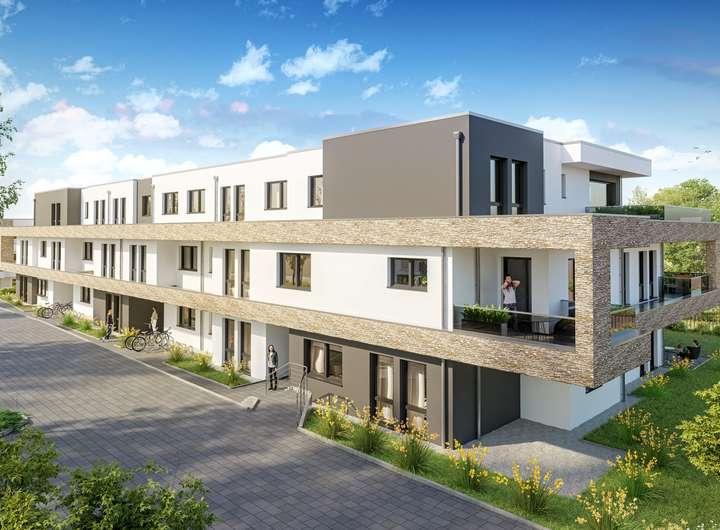 Das 3-geschossige Mehrfamilienhaus gewinnt durch die klare Gliederung der Fassade. Die Wohnungen überzeugen durch ihre gelungene Verbindung von Licht, Exklusivität und optimaler Nutzungsmöglichkeit. Die Wirkung der bodentiefen Fenster mit der feinen Unterteilung wird durch die transparenten Balkonbrüstungen unterstrichen. Farben, Formen und Materialien sind aufeinander abgestimmt. Eine besondere Atmosphäre entsteht in den Staffelgeschoss-Wohnungen.