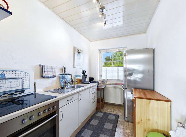 Die Küche ist praktisch geschnitten, zeitlos gestaltet und mit modernen Elektrogeräten ausgestattet. Ein zusätzliches Gäste-WC mit Dusche sowie Abstellmöglichkeiten runden das Erdgeschoss ab.