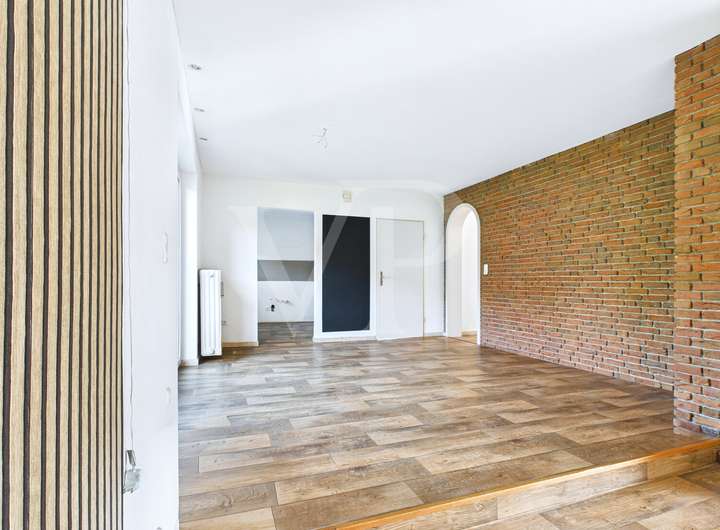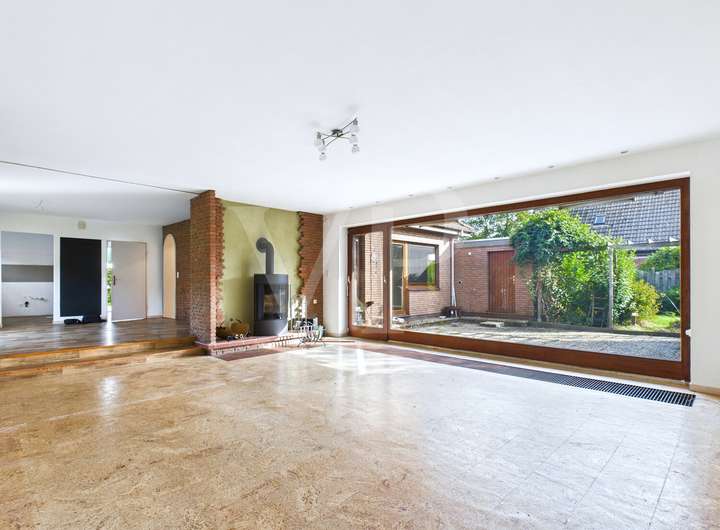 Der helle Eingangsbereich führt in den großzügigen Wohn- und Essbereich mit Kamin. Große Fensterflächen lassen viel Licht herein und öffnen den Blick in den Garten – perfekt für gemütliche Abende und gesellige Runden. Die Küche ist funktional geschnitten und kann bei Bedarf offen gestaltet werden. Zwei zusätzliche Räume bieten Platz für Büro, Gäste oder Hobbyräume.
