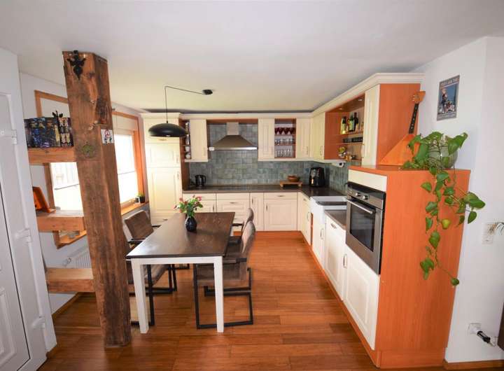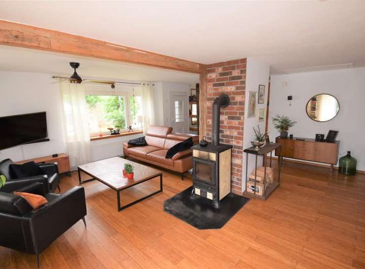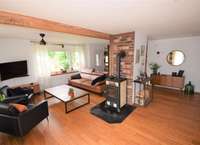 Im zentralen und sehr großzügigen Wohnzimmer sorgt im Winter ein rustikaler Kaminofen für wohlige Wärme. Die angegliederte offene Küche bietet Platz für eine Esszimmergarnitur.