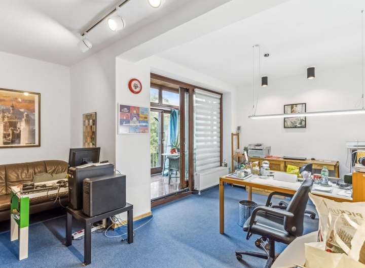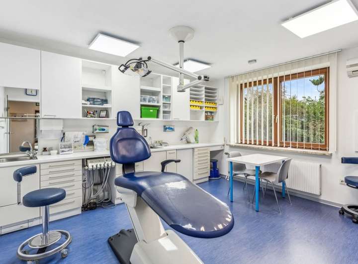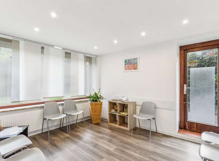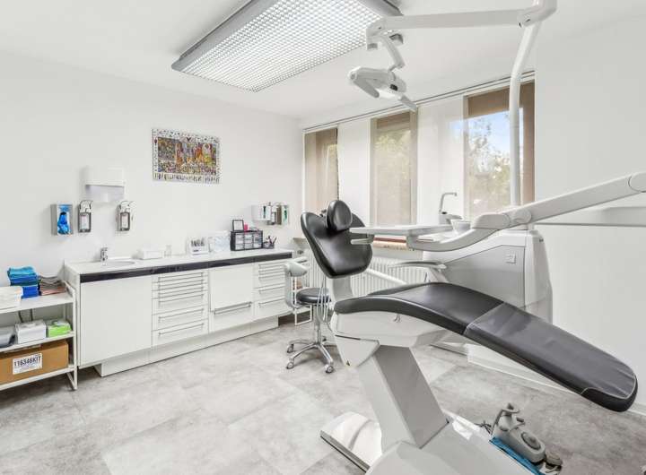 Im Erdgeschoss befindet sich eine voll ausgestattete Zahnarztpraxis mit vier Behandlungsräumen, zwei separaten Büroräumen sowie einem Empfangsbereich und Wartezimmer. Die Behandlungsräume sind klimatisiert und bieten damit sowohl Patienten als auch Personal ein angenehmes Arbeits- und Raumklima. Im Kellergeschoss stehen darüber hinaus großzügige Abstellflächen zur Verfügung sowie ein kleines Labor, das zur Praxis gehört. Die gewerbliche Einheit ist funktional und gepflegt und eignet sich ideal zur weiteren Nutzung im medizinischen Bereich oder gegebenenfalls zur Umgestaltung für andere gewerbliche Zwecke.