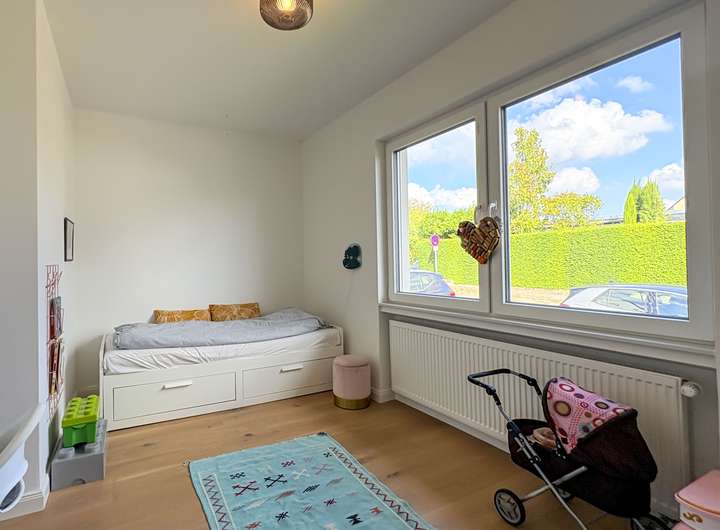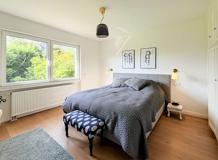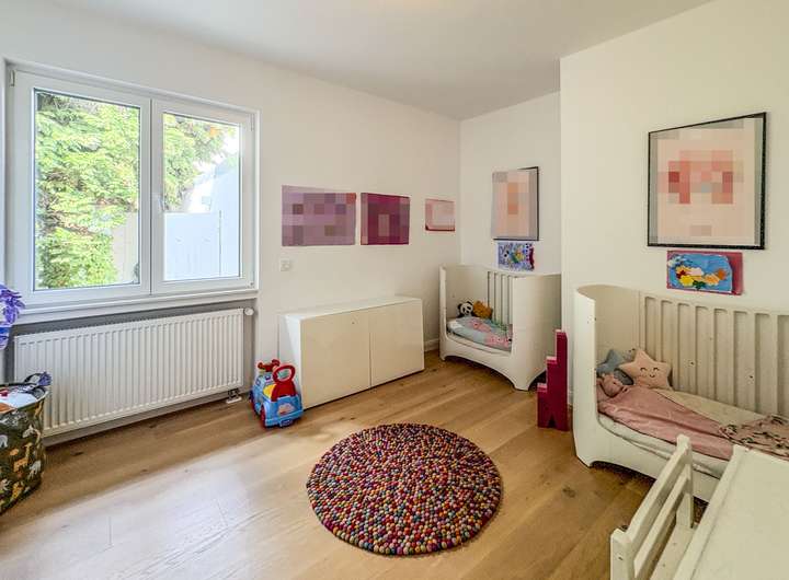 Abgegrenzt zum Wohnbereich befindet sich der weitläufige Schlafbereich mit einem Elternschlafzimmer und dazugehörigem ensuite-Bad (mit Fußbodenheizung), das an eine private Wellness-Oase erinnert, sowie drei Kinder- oder Gästezimmern mit separatem Duschbad.