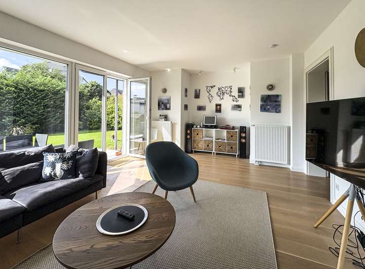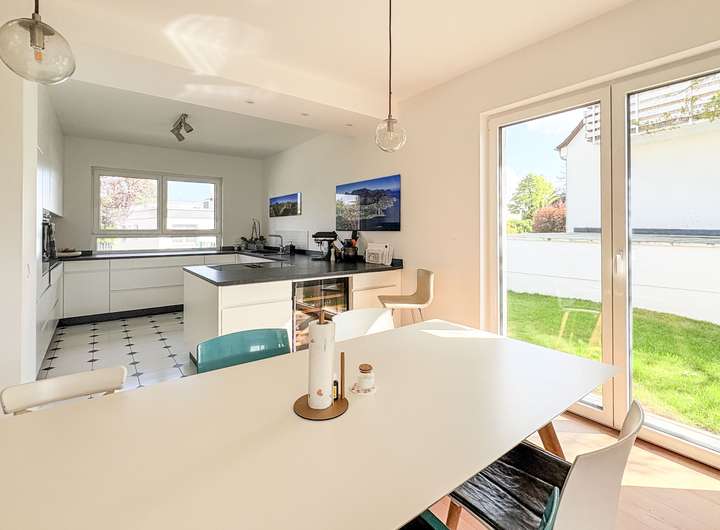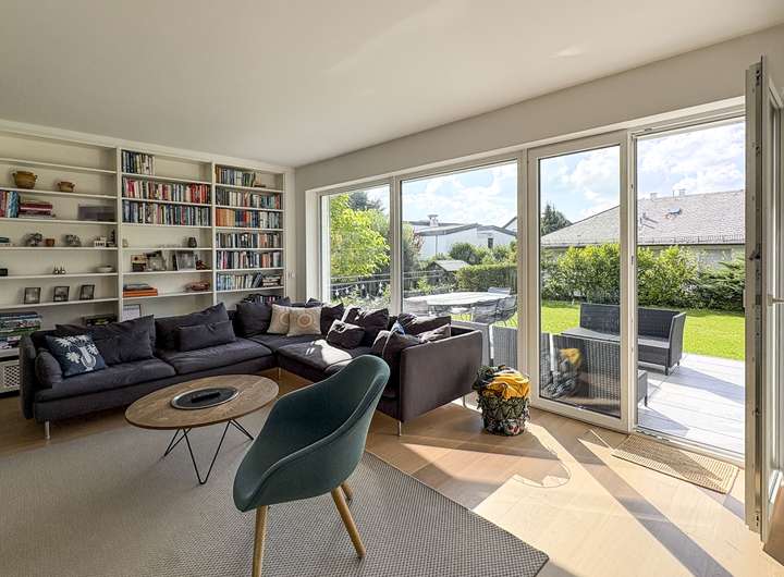 Der Wohnbereich im Erdgeschoss ist der ideale Empfangs- und Aufenthaltsort für Groß und Klein, Verwandte, Freunde oder Geschäftspartner. Das Wohnzimmer ist offen zur Küche hin und bietet daher einen weiten, repräsentativen Raum zur Entspannung und für ein gemütliches Beisammensein.