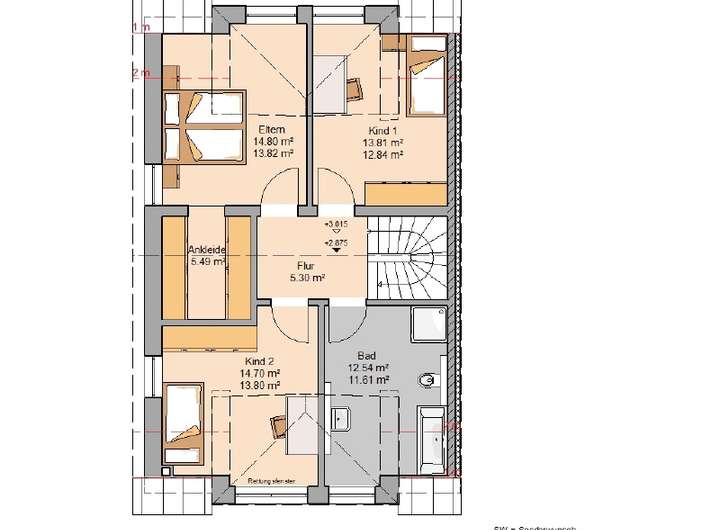 Über die u-förmige Treppe erreicht man das 63 m² große Dachgeschoss. Hier bekommt jedes Familienmitglied seinen eigenen Rückzugsort. Zwei Kinderzimmer, ein geräumiges Elternschlafzimmer mit angrenzender Ankleide und ein großes Familienbad bilden das geräumige Dachgeschoss.