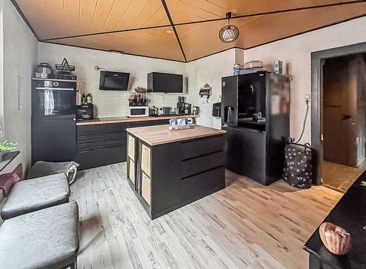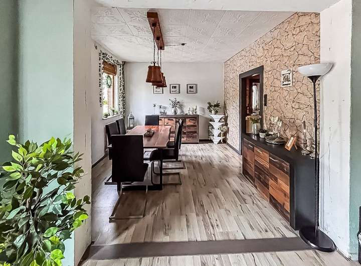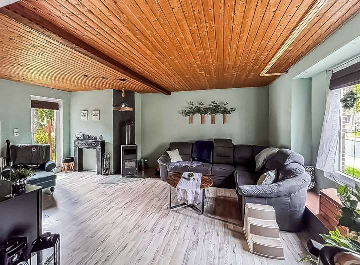 Über den Eingangsbereich des Haupthauses gelangen Sie über einen Windfang und einen Flur in das lichtverwöhnte Wohn- und Esszimmer, wo neben einer großzügigen Wohnlandschaft auch eine gemütliche Esszimmergarnitur Ihren Platz findet. Ein Kaminofen spendet wohlige Wärme an kalten Tagen.