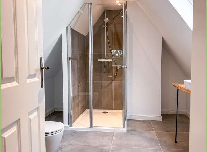 Das Dachgeschoss wurde vollständig erneuert und mit ökologischen Materialien neu aufgebaut: Hanf- und Holzwolle dienen als Dämmung, die Wände wurden mit Lehmbauplatten versehen, zweifach mit Lehm verputzt und mit Kaseinfarbe gestrichen. Diese Kombination sorgt für ein natürlich reguliertes Raumklima und ein wohngesundes Ambiente. Ein modernes Duschbad mit Blick in die Natur rundet diesen besonderen Rückzugsort ab. Das Dach ist mit langlebigen, regionaltypischen roten Tonpfannen eingedeckt.