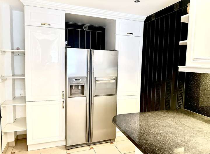 - Zeitlos gestaltete Einbauküche mit Doppeltür-Kühlschrank