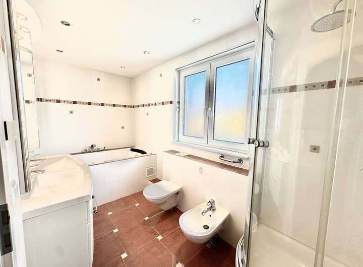 Im Obergeschoss befinden sich drei Schlafzimmer sowie ein großzügiges Tageslichtbad mit Eckbadewanne mit Whirlpool-Funktion, Doppelwaschtisch, Dusche und Bidet.